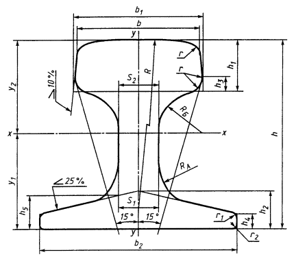 3 Постановлением Государственного комитета Российской Федерации по стандартизации и метрологии от 18 декабря 2001 г. № 536-ст межгосударственный стандарт ГОСТ 4121-96 введен в действие непосредственно в качестве государственного стандарта Российской Федерации с 1 июля 2002 г. 4 ВЗАМЕН ГОСТ 4121-76 МЕЖГОСУДАРСТВЕННЫЙ СТАНДАРТ РЕЛЬСЫ КРАНОВЫЕ Технические условия Crane rails. Дата введения 2002-07-01 1 Область примененияНастоящий стандарт распространяется на стальные крановые рельсы специальных профилей типов КР70, КР80, КР100, КР120, КР140, применяемые для путей грузоподъемных кранов. Требования 3.4, 3.6 и последнего абзаца 4.4 являются рекомендуемыми. 2 Нормативные ссылкиВ настоящем стандарте использованы ссылки на следующие стандарты: ГОСТ 1497-84 (ИСО 6892-84) Металлы. Методы испытания на растяжение ГОСТ 7565-81 (ИСО 377-2-89) Чугун, сталь и сплавы. Метод отбора проб для химического состава ГОСТ 7566-94 Металлопродукция. Приемка, маркировка, упаковка, транспортирование и хранение ГОСТ 9012-59 (ИСО 410-82, ИСО 6506-81) Металлы. Метод измерения твердости по Бринеллю ГОСТ 12359-81 (ИСО 4945-77) Стали углеродистые, легированные и высоколегированные. Методы определения азота ГОСТ 22536.0-87 Сталь углеродистая и чугун нелегированный. Общие требования к методам анализа ГОСТ 22536.1-88 Сталь углеродистая и чугун нелегированный. Методы определения общего углерода и графита ГОСТ 22536.2-87 Сталь углеродистая и чугун нелегированный. Методы определения серы ГОСТ 22536.3-88 Сталь углеродистая и чугун нелегированный. Методы определения фосфора ГОСТ 22536.4-88 Сталь углеродистая и чугун нелегированный. Методы определения кремния ГОСТ 22536.5-87 (ИСО 629-82) Сталь углеродистая и чугун нелегированный. Методы определения марганца ГОСТ 22536.6-88 Сталь углеродистая и чугун нелегированный. Методы определения мышьяка ГОСТ 22536.7-88 Сталь углеродистая и чугун нелегированный. Методы определения хрома ГОСТ 22536.8-87 Сталь углеродистая и чугун нелегированный. Методы определения меди ГОСТ 22536.9-88 Сталь углеродистая и чугун нелегированный. Методы определения никеля 3 Основные параметры и размеры3.1 Поперечное сечение рельсов должно соответствовать указанному на рисунке 1. 3.2 Размеры рельсов, площадь поперечного сечения, справочные величины и масса 1 м должны соответствовать указанным в таблицах 1 и 2. Рисунок 1 Таблица 1 В миллиметрах