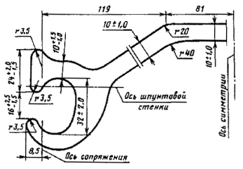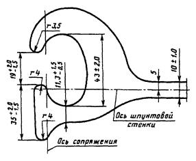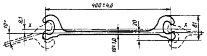 Черт. 4 1.4. Поперечное сечение и размеры замка шпунтового корытного профиля ШК-1 должны соответствовать указанным на черт. 4. 1.5. В соответствии с заказом профили для шпунтовых свай изготавливают длиной от 8 до 22 м: - мерной длины, - мерной длины с отрезками в количестве не более 10 % массы партии. Отрезком считается профиль длиной от 5 до 8 м. 1.6. Предельное отклонение по длине не должно превышать + 100мм. По требованию потребителя: +45 мм - при длине 8 м; +5 мм на каждый метр длины - при длине свыше 8 м, но не более 100 мм. 1.7. Шпунтовые профили изготовляют с двумя монтажными отверстиями диаметром 50 мм, расположенными на продольной оси стенки на расстоянии 500 мм от концов. По требованию потребителя взамен монтажных отверстий вырезают отверстия для крепления вибратора. Примеры условных обозначений: Плоский профиль для шпунтовых свай ШП-1 из стали марки Ст3пс: ШП-1 Ст3пс ГОСТ 4781-85 Корытный профиль для шпунтовых свай ШК-1 из стали марки Ст3пс: ШК-1 Ст3пс ГОСТ 4781-85. 1.6, 1.7. (Измененная редакция, Изм. 1). 2. ТЕХНИЧЕСКИЕ ТРЕБОВАНИЯ2.1. Профили для шпунтовых свай изготавливают в соответствии с требованиями настоящего стандарта по технологическому регламенту, утвержденному в установленном порядке. 2.2. Профили для шпунтовых свай изготавливают из углеродистой стали марок Ст3сп, Ст3пс по ГОСТ 380. (Измененная редакция, Изм. № 1). 2.3. На наружной поверхности профиля, в торцах и в замковой части не должно быть раскатанных пузырей, закатов, прокатных плен. Дефекты должны быть удалены пологой вырубкой или зачисткой. Ширина вырубки или зачистки должна быть не менее пятикратной глубины. Глубина вырубки или зачистки не должна превышать минусового предельного отклонения по размеру профиля. Поперечная вырубка или зачистка не допускаются. Допускаются без зачистки отдельные раскатанные загрязнения, царапины, рябизна, отпечатки, не выводящие размеры профиля за пределы минусового предельного отклонения. 2.4. Концы профиля должны быть обрезаны перпендикулярно к их оси, и по требованию потребителя ус на торце профиля должен быть удален. 2.5. Осевая растягивающая нагрузка в замке для плоских профилей должна быть не менее 24,5 кН/см. 2.6. Профили должны поставляться после правки. Кривизна не должна превышать 3 мм на 1м длины. Общая кривизна не должна превышать: 0,2 % длины - для профилей длиной до 15 м; 30 мм - для профилей длиной свыше 15 м. 3. ПРАВИЛА ПРИЕМКИ3.1. Профили для шпунтовых свай принимают партиями. Партия должна состоять из профилей одного размера, одной плавки, одной марки стали и оформлена одним документом о качестве (ГОСТ 7566). 3.2. Проверяют качество поверхности и размеры каждого профиля. 3.3. Для проверки химического состава пробы отбирают по ГОСТ 7565. 3.4. Для испытания на растяжение от партии отбирают 2 прутка. 3.5. При получении неудовлетворительных результатов проверки хотя бы по одному показателю повторную проверку проводят в соответствии с ГОСТ 7566. 4. МЕТОДЫ ИСПЫТАНИЙ4.1. Химический состав определяют по ГОСТ 22536.0, ГОСТ 22536.10, ГОСТ 27809, ГОСТ 18895. 4.2. Для плоских профилей шпунтовых свай ШП-1 замки испытывают на прочность следующим образом. От каждого отобранного профиля для испытания на растяжение отрезают по одному поперечному образцу толщиной 7 см. Каждый образец разрезают на две равные части по продольной оси профиля. Обе половины разрезанного образца профиля соединяют в замок и испытывают на раст