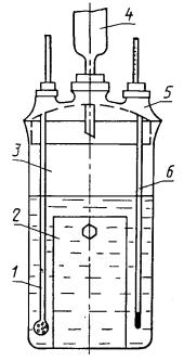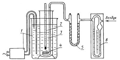 где m1 - масса образца металла до испытания, г; m2 - масса образца металла после испытания, г; l - длина образца металла, мм; а - ширина образца металла, мм; b - толщина образца металла, мм; 106 - коэффициент пересчета площади поверхности образца в квадратные метры. За результат испытания принимают среднеарифметическое результатов трех параллельных определений, относительное допускаемое расхождение между наиболее отличающимися значениями которых не должно превышать 50 % их среднего значения. Относительная суммарная погрешность результатов испытаний для меди, латуни, алюминия, чугуна и стати ±28 %, для припоя ±50 % при доверительной вероятности Р= 0,95. 4.6. Определение вспениваемости 4.6.1. Метод заключается в том, что через определенный объем испытуемой охлаждающей жидкости при заданной температуре продувают воздух с установленным объемным расходом в течение заданного времени, а затем измеряют объем образовавшейся пены (V) и время, в течение которого она сохраняется, - устойчивость (τ). 4.6.2. Аппаратура, реактивы и растворы Установка для определения вспениваемости (черт. 3). Установка для определения вспениваемости 1 - водяная баня с термостатом; 2 - термометр; 3 - мерный цилиндр; 4 - газопромыватель; 5 - трубка с хлористым кальцием; 6 - реометр Черт. 3 Цилиндр 1-500 по ГОСТ 1770. Цилиндр 1-100 по ГОСТ 1770. Весы 2-го класса точности по ГОСТ 24104 с наибольшим пределом взвешивания 200 г. Водяная баня, обеспечивающая поддержание температуры нагрева (88±2) °С, состоящая из стакана В-1-2000 ТС или В-1-3000 ТС, или В-1-5000 ТС по ГОСТ 25336 и термостата. Газопромыватель ГФП-20-ПОР40 или ГФИ-20-ПОР40 по ГОСТ 25336. Термометр. Реометр стеклянный лабораторный по ГОСТ 9932 или реометр по ГОСТ 13045. Трубка TX-V-2-100 по ГОСТ 25336. Секундомер по ТУ 25-1819.0021, ТУ 25-1894.003. Кальций хлористый гранулированный. Вода дистиллированная по ГОСТ 6709. Ацетон по ГОСТ 2603. Хромовая смесь (раствор бихромата калия по ГОСТ 4220 с массовой долей 5 % в серной кислоте по ГОСТ 4204, приготовляемый по ГОСТ 4517, п. 2.152). Воздух сжатый 3, 5 и 7-го классов по ГОСТ 17433 и ГОСТ 24484. Кислота соляная по ГОСТ 3118. Цинк хлористый по ГОСТ 7345. 4.6.3. Подготовка к испытанию Для проведения испытания собирают установку, состоящую из мерного цилиндра, газопромывателя, термометра, водяной бани с термостатом, реометра, трубки с хлористым кальцием. Перед началом каждого испытания цилиндр и газопромыватель моют последовательно ацетоном, хромовой смесью, дистиллированной водой и сушат воздухом. Для проведения испытания охлаждающую жидкость ОЖ-К разбавляют в объемном отношении 1:1 раствором хлористого цинка, приготовленного следующим образом: в 100 г раствора хлористого цинка с массовой долей 35,5 % добавляют при перемешивании 2,5 см3 соляной кислоты и 1,38 г полученной смеси разводят в 5 дм3 дистиллированной воды. Рабочие охлаждающие жидкости ОЖ-65 и ОЖ-40 испытывают не разбавляя. 4.6.4. Проведение испытаний В цилиндр помещают 145 см3 испытуемой жидкости, термометр, газопромыватель и устанавливают его в термостатированную водяную баню температурой (88±2) °С. Когда температура испытуемого раствора в цилиндре достигнет (88±2) °С, уточняют и фиксируют его объем (Vж). Затем через газопромыватель пропускают воздух с объемным расходом (1000±25) см3/мин. При появлении пузырьков воздуха в испытуемом растворе включают секундомер. По истечении