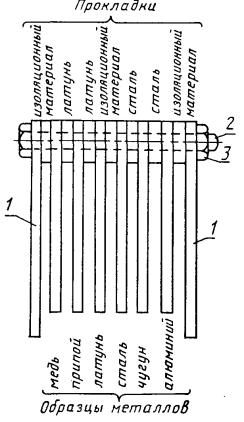 где m1 - масса стакана, г; m2 - масса стакана с конденсатом, г; mж - масса навески испытуемой жидкости, г. За результат испытания принимают среднеарифметическое результатов трех параллельных определений, абсолютное расхождение между наиболее отличающимися значениями которых не должно превышать 0,5 %. Абсолютная суммарная погрешность результата испытания ±0,5 % при доверительной вероятности Р = 0,95. 4.5. Определение коррозионного воздействия 4.5.1. Метод заключается в том, что в испытуемую жидкость помещают образцы металлов в установленном наборе и определенных размеров и выдерживают их в ней непрерывно указанное время при заданной температуре. Затем по изменению массы образцов определяют коррозионное воздействие испытуемой жидкости. 4.5.2. Аппаратура, реактивы и материалы Установка для определения коррозионного воздействия на металлы (черт. 1). Держатель образцов металлов (черт. 2). Образцы металлов в соответствии с НТД на конкретный вид охлаждающей жидкости. Весы 2-го класса точности по ГОСТ 24104 с наибольшим пределом взвешивания 200 г. Термостат, обеспечивающий температуру нагрева до (100±2) °С. Эксикатор по ГОСТ 25336. Секундомер по ТУ 25-1819.0021, ТУ 25-1894.003. Штангенциркуль по ГОСТ 166. Реометр по ГОСТ 9932 или ротаметр по ГОСТ 13045. Термометр по ГОСТ 28498. Холодильник ХШ 3-400 ХС или ХШ 2-400 ХС по ГОСТ 25336. Наждачная бумага К3-М-14 или 51СМ28 по ГОСТ 10054 или шкурка шлифовальная бумажная по ГОСТ 6456. Установка для определения коррозионного воздействия на металлы 1 - аэратор; 2 - держатель образцов металлов; 3 - сосуд; 4 - обратный холодильник; 5 - пришлифованная крышка; 6 - термометр Черт. 1 Спирт этиловый по ГОСТ 5962* или по ГОСТ 18300. * На территории Российской Федерации действует ГОСТ Р 51652-2000. Ацетон по ГОСТ 2603. Вода дистиллированная по ГОСТ 6709. Кислота соляная по ГОСТ 3118. Хромовый ангидрид по ГОСТ 3776. Кислота ортофосфорная по ГОСТ 6552. Кислота азотная по ГОСТ 4461. Натрий едкий по ГОСТ 11078 или ГОСТ 4328. Цинк гранулированный. Медь М-1 или М-3 по ГОСТ 859. Латунь Л-63 по ГОСТ 2208 или ГОСТ 931. Сталь 20(10) по ГОСТ 1050. Чугун Сч 24-44 или Сч 18-36 по ГОСТ 1412. Алюминий АЛ9 по ГОСТ 1583. Припой ПОС 40-2 по ГОСТ 21930 или ПОС СУ 30-2 по ГОСТ 21930. Аммоний лимонно-кислый по ТУ 6-09-01-755 или ТУ 6-09-01-768. Аммиак по ГОСТ 3760. Кислота уксусная по ГОСТ 6968. Натрий сернокислый безводный по ГОСТ 4166. Натрий хлористый по ГОСТ 4233. Натрий двууглекислый по ГОСТ 4201. Воздух сжатый 3, 5 и 7-го классов по ГОСТ 17433 и ГОСТ 24484. Допускается применение аппаратуры по классу точности, а также реактивов аналогичной квалификации по качеству не ниже указанных в настоящем стандарте. По требованию потребителей допускается применение других марок металлов. Установка для определения коррозионного воздействия на металлы (см. черт. 1) представляет собой сосуд 3 вместимостью 300-500 см3 диаметром 55-60 мм, изготовленный из термостойкого стекла. Сосуд закрывается пришлифованной крышкой 5, имеющей три горловины: для обратного холодильника 4, аэратора 1, представляющего собой стеклянную трубку, имеющую на погружаемом конце шарик с отверстиями диаметром 0,5-1,0 мм, и термометра 6. Держатель образцов металлов (см. черт. 2) представляет собой приспособление, состоящее из крепежного винта 2 длиной (50,0±0,5) мм, диаметром 4,5-5,0 мм, изготовленного из изоляционного материала (текстолит, тефлон, эбонит, фторопласт), с резьбой и гайкой 3 на конце из того же материала, двух латунных подставок 7 размером (60