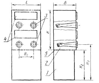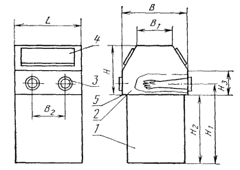 Срок действия с 01.07.90 до 01.07.95 Несоблюдение стандарта преследуется по закону Настоящий стандарт распространяется на металлические и пластмассовые радиационно-защитные боксы с перчатками, с толщинами радиационной защиты из стали не более 2,5 мм или из органического стекла и других пластмасс не более 10 мм, оснащенные герметичными перчатками, предназначенные для работы с радиоактивными веществами в открытом виде по I, II и III классам работ, определяемым «Основными санитарными правилами работы с радиоактивными веществами и другими источниками ионизирующих излучений ОСП 72/87», утвержденными Главным Государственным санитарным врачом. Стандарт не распространяется на радиационно-защитные боксы, предназначенные для применения на передвижных объектах, а также боксы, предназначенные для специальных целей. Термины и определения основных понятий, используемых в стандарте, - по ГОСТ 16950. 1. Радиационно-защитные боксы с перчатками в зависимости от числа сторон обслуживания, геометрического профиля корпуса защитного бокса и размеров его должны быть следующих типов: 1БП - одностороннего обслуживания; 2БП - одностороннего обслуживания высокий; 3БП - одностороннего обслуживания с двухъярусным расположением перчаток; 4БП - двухстороннего обслуживания; 5БП - двухстороннего обслуживания высокий; 6БП - одностороннего обслуживания настольный; 7БП - одностороннего обслуживания настольный низкий. 2. Защитные боксы типов 1БП - 5БП следует разделять на виды: 1 - одномодульные; 2 - двухмодульные; 3 - трехмодульные и т.д. Защитные боксы типов 6БП и 7БП следует выполнять одномодульными. Примечания: 1. Под модулем защитного бокса понимают длину корпуса бокса, определенную оптимальным обслуживанием рабочего объема защитного бокса одним оператором при одностороннем обслуживании или двумя операторами при двухстороннем обслуживании. 2. Многомодульные боксы внутренних перегородок, как правило, не имеют. 3. Допускается в обоснованных случаях принимать длину корпуса защитного бокса кратной половине модуля. 3. Защитные боксы с перчатками должны изготавливаться из материалов: коррозионно-стойкой (нержавеющей) стали (нж); углеродистой стали с соответствующим покрытием (ст); органического стекла (ос). Примечание. Допускается изготовление защитных боксов из других материалов, характеристики которых соответствуют характеристикам указанных материалов. 4. Типы и основные размеры защитных боксов должны соответствовать указанным на черт. 1 - 7 и в табл. 1. Защитный бокс 1БП1 1 - подставка; 2 - корпус; 3 - перчатки; 4 - окно; 5 - столешница. Черт. 1 Защитный бокс 2БП1