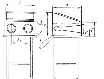 1 - корпус; 2 - перчатки; 3 - окно; 4 - столешница. Черт. 6 Защитный бокс 7БП1 1 - корпус; 2 - перчатки; 3 - окно; 4 - столешница. Черт. 7 Таблица 1