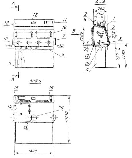 1 - корпус; 2 - душевик-распылитель; 3 - перчатки; 4 - подставка; 5 - сборник жидких отходов; 6 - вентильная панель; 7 - заглушка люка; 8, 10 - окно по ГОСТ 23410; 9 - светильник; 11 - пульт управления; 12 - тягонапоромер; 13 - панель приборов; 14 - монтажная дверь; 15 - фильтр вытяжной; 16 - фильтр приточный; 17 - дверка люка; 18 - обойма; 19 - 2 люка; 20 - люк для транспортера (К×Л) Черт. 9 Защитный бокс 3БП2-нж