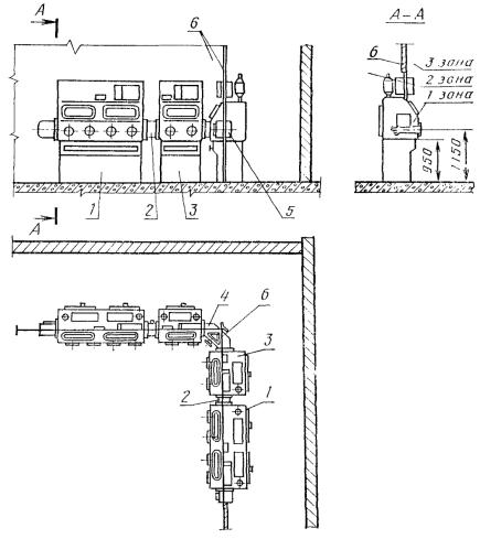 * В боксах типов 1БП - 5БП, устанавливаемых к стене, монтажные проемы могут быть выполнены в любом другом удобном месте корпуса с размерами, определяемыми его конструкцией. Вместо монтажных проемов могут использоваться проемы смотровых окон. ** При присоединении траспортера к боковой стенке транспортным люком может служить шлюзовой люк. Цепочка из защитных боксов без транспортера при трехзональной планировке помещения 1 - защитный бокс 1БП2; 2 - шлюз промежуточный; 3 - защитный бокс 1БП1; 4 - шлюз промежуточный угловой; 5 - шлюз; 6 - зональная перегородка Черт. 14 Пример условного обозначения радиационно-защитного бокса типа 2БП двухмодульного из коррозионно-стойкой (нержавеющей) стали: Защитный бокс 2БП2-нж ГОСТ 28164-89 5. Общие технические требования к конструкции металлических защитных боксов - по ГОСТ 23309. 6. Примеры конструкций защитных боксов, цепочки из них без транспортера с трехзональной планировкой помещения и дополнительные параметры защитных боксов и размеры их составных частей приведены в приложении (черт. 8 - 14 и табл. 2). ИНФОРМАЦИОННЫЕ ДАННЫЕ1. УТВЕРЖДЕН И ВВЕДЕН В ДЕЙСТВИЕ Постановлением Государственного комитета СССР по стандартам от 22.06.89 № 1851 2. Срок проверки - 1993 г; периодичность проверки - 5 лет 3. Введен впервые 4. ССЫЛОЧНЫЕ НОРМАТИВНО ТЕХНИЧЕСКИЕ ДОКУМЕНТЫ