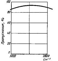 Черт. 1 3.1. Проверка чистоты четыреххлористого углерода Чистоту четыреххлористого углерода проверяют перед его использованием. С этой целью снимают спектр четыреххлористого углерода на спектрофотометре в кювете с толщиной поглощающего свет слоя 1 см в области 2800-3000 см-1 и сравнивают его со спектром чистого четыреххлористого углерода (черт. 1). Для образцов четыреххлористого углерода, имеющих в аналитической области полосы с поглощением более 50 %, необходима очистка. Очистку четыреххлористого углерода проводят на обычной перегонной установке на шлифах при атмосферном давлении. 3.2. Подготовка четыреххлористого углерода, используемого в качестве контрольного раствора В стаканчик помещают 40 см3 четыреххлористого углерода и испаряют его в вытяжном шкафу на песчаной бане или в сушильном шкафу при температуре 65 °С-70 °С. Стаканчик промывают 5 см3 четыреххлористого углерода и записывают его спектр относительно исходного растворителя. Если в спектре появляются полосы, значение поглощения которых более 20 %, четыреххлористый углерод следует перегнать. После испарения аммиака пробоотборник промывают с помощью шприца (пипетки) двумя порциями четыреххлористого углерода объемом по 15-20 см3. Раствор сливают в стаканчик через стеклянный фильтр. Четыреххлористый углерод испаряют в вытяжном шкафу на песчаной бане или в сушильном шкафу при температуре 65 °С-70 °С. 4. ПРОВЕДЕНИЕ АНАЛИЗАСпектр поглощения пробы