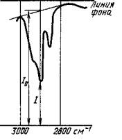 Черт. 2 В стаканчик с пробой, обработанной, как указано в п. 3.3, помещают шприцем (пипеткой) 5 см3 четыреххлористого углерода, стаканчик закрывают крышкой и тщательно смывают растворителем масло со стенок. Одну кювету заполняют полученным раствором, вторую - контрольным раствором, приготовленным, как указано в п. 3.2, и записывают спектр анализируемого раствора в области поглощения 2800-3000 см-1 при спектральной ширине щели, не превышающей 5 см-1. Линию фона проводят через точки спектра, соответствующие v = 2800 см-1 и v = 3000 см-1 на спектрограмме, измеряют значения пропусканий I0 и I, как указано на черт. 2, и рассчитывают оптическую плотность (D) в максимуме полосы v = 2925 см-1 по формуле