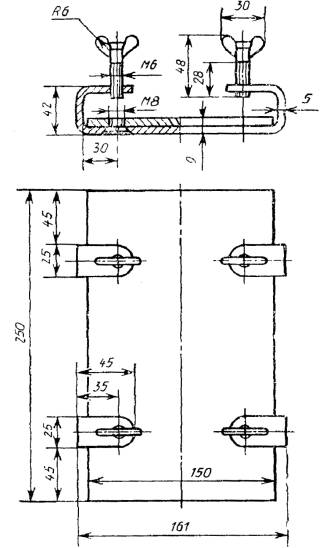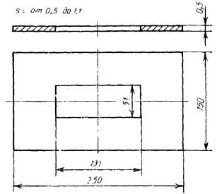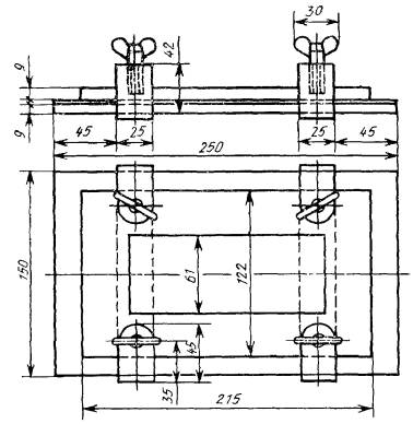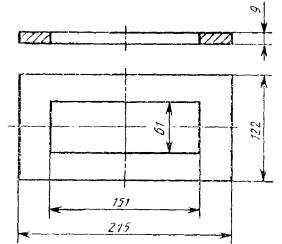 1.2.5.4. Лица, связанные с изготовлением и применением шпатлевок, должны быть обеспечены средствами индивидуальной защиты по ГОСТ 12.4.011. 1.2.5.5. Средства тушения пожара: песок, кошма, огнетушители марки ОП-05, пенные установки. Контроль за соблюдением предельно допустимых выбросов (ПДВ) должен осуществляться в соответствии с ГОСТ 17.2.3.02. Все твердые и жидкие отходы, образующиеся после фильтрации, промывки оборудования, коммуникаций, чистки окрасочных камер в виде загрязненных растворителей и использованных фильтров должны быть собраны в специальные автоцистерны и емкости, своевременно вывезены и подвергнуты ликвидации в соответствии с порядком накопления, транспортировки, обезвреживания и захоронения промышленных отходов. 1.3. Маркировка 1.3.1. Маркировка шпатлевок ЭП-0010 и ЭП-0020 - по ГОСТ 9980.4. 1.3.2. На транспортную тару должны быть нанесены манипуляционный знак «Боится нагрева» по ГОСТ 14192, знак опасности и классификационный шифр группы опасных грузов 3212 по ГОСТ 19433, серийный номер ООН - 1139. 1.4. Упаковка 1.4.1. Шпатлевочную пасту, отвердитель № 1 и ДЭТА упаковывают по ГОСТ 9980.3. 1.4.2. Металлические и полиэтиленовые банки со шпатлевкой, предназначенные для розничной торговли, допускается упаковывать в ящики из сплошного склеенного картона. 2. ПРИЕМКА2.1. Правила приемки - по ГОСТ 9980.1. 2.2. Показатели 8 и 9 табл. 1 изготовитель определяет периодически в каждой десятой партии. 2.3. При получении неудовлетворительных результатов периодических испытаний изготовитель проверяет каждую партию до получения удовлетворительных результатов испытаний подряд не менее чем в трех партиях. 3. МЕТОДЫ ИСПЫТАНИЙ3.1. Отбор проб - по ГОСТ 9980.2. Перед испытанием пробы шпатлевочной пасты в плотно закрытой таре доводят до температуры (20 ± 2) °С. В зимнее время допускается перед отбором проб разогревать шпатлевочную пасту в плотно закрытой таре при температуре не выше 60 °С. 3.2. Подготовка образцов к испытанию Эластичность шпатлевочного покрытия при изгибе определяют на пластинках из черной жести по ГОСТ 13345 толщиной 0,25 - 0,32 мм и размером 70 ´ 170 мм. Влагопоглощаемость определяют на алюминиевых пластинках по ГОСТ 21631 или ГОСТ 13726 размером 50 ´ 50 мм и толщиной 0,2 - 0,3 мм. Остальные показатели определяют на пластинках из стали марок 08кп или 08пс по ГОСТ 16523 размером 70 ´ 150 мм и толщиной 0,8 - 0,9 мм. Для нанесения шпатлевок применяются незагрунтованные пластинки, подготовленные по ГОСТ 8832, разд. 3. Условную вязкость и массовую долю нелетучих веществ определяют в шпатлевочной пасте. Для определения остальных показателей шпатлевочную пасту, смешанную с отвердителем, как указано в п. 1.2.2, перед нанесением на пластинки выдерживают в течение 15 - 20 мин. На подготовленные пластинки шпатлевку наносят шпателем при помощи специального устройства. Устройство для нанесения шпатлевок (черт. 1 - 4) состоит из стальной плиты, к которой прикреплены четыре скобы с упорными барашками, прижимной стальной рамки и металлических трафаретов различной толщины. Поверхности плиты и рамки должны быть пришлифованы. Подготовленную пластинку плотно зажимают между плитой и трафаретом при помощи рамки и упорных барашков и наносят на нее шпатлевку металлическим шпателем до краев трафарета, снимая избыток. Размер выреза в трафарете 50 ´ 130 мм. Для нанесения шпатлевок ЭП-0010 и ЭП-0020 применяется трафарет толщиной 0,5 мм. Толщина шп