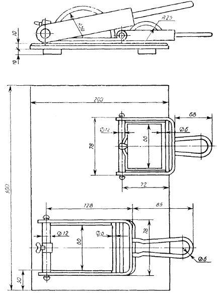 Черт. 3 Черт. 4 Перед горячей сушкой пластинки с нанесенной шпатлевкой выдерживают при температуре (20 ± 2) °С в течение 1 ч. После горячей сушки пластинки с нанесенной шпатлевкой выдерживают при температуре (20 ± 2) °С в течение 3 ч. При разногласиях в оценке качества шпатлевок ЭП-0010 и ЭП-0020 по показателям 1, 5, 6 и 7 табл. 1, пластины сушат при температуре (20 ± 2) °С в течение 24 ч. Шлифование (при смачивании пластинок водой) проводят шлифовальной шкуркой зернистостью № 4 - 6 по ГОСТ 6456 или ГОСТ 10054. 3.4. Условную вязкость шпатлевочной пасты определяют по ГОСТ 8420. Перед определением шпатлевочную пасту разбавляют толуолом по ГОСТ 9880 или ГОСТ 14710 в соотношении по массе: 1 часть растворителя и 4 части шпатлевочной пасты. 3.5. Массовую долю нелетучих веществ определяют по ГОСТ 17537. Навеску массой (2,0 ± 0,2) г нагревают в сушильном шкафу при температуре (120 ± 2) °С. Первое взвешивание проводят через 3 ч сушки. Последующие взвешивания проводят через каждые 30 мин до достижения постоянной массы. Допускается определение массовой доли нелетучих веществ под инфракрасной лампой при температуре (120 ± 2) °С. При разногласиях в оценке массовой доли нелетучих веществ за окончательный результат принимают определение, проведенное в сушильном шкафу. 3.6. Определение эластичности при изгибе Эластичность шпатлевочного покрытия при изгибе определяют на приборе для определения эластичности шпатлевок (черт. 5). Прибор состоит из металлической плиты, к которой прикреплены полуцилиндры диаметром 100 и 50 мм, подвижной рамки с прижимным валиком для прижимания пластинки к цилиндрической поверхности, винта крепления и деревянной подставки. Пластинку укрепляют одним концом на приборе при помощи винта крепления и при опускании рамки в горизонтальное положение прижимают валиком к цилиндрической поверхности. Испытание проводят на трех образцах. Шпатлевку считают соответствующей настоящему стандарту, если на ее поверхности при изгибе по полуцилиндру диаметром 50 мм не образуется трещин, видимых без увеличительных приборов. Трещины на расстоянии до 15 мм от краев шпатлевочного покрытия в расчет не принимают. После высыхания поверхность шпатлевки шлифуют водостойкой шлифовальной шкуркой зернистостью № 4 - 6 по ГОСТ 10054, ГОСТ 6456 или ГОСТ 5009. Шлифование проводят равномерно по всей поверхности, смачивая ее водой. После шлифования поверхность шпатлевки промывают водой и насухо протирают мягкой тканью. Прибор для определения эластичности шпатлевок при изгибе Черт. 5 Шпатлевка соответствует настоящему стандарту, если при шлифовании в течение 15 мин она не размокает и образуется ровная матовая поверхность. 3.8. Определение срока годности шпатлевок 3.8.1. Срок годности шпатлевок при нанесении их методом пневматического распыления определяют по ГОСТ 27271. Для испытания берут (150,0 ± 0,2) г шпатлевочной пасты ЭП-0010, добавляют (12,75 ± 0,2) г отвердителя № 1 или (4,5 ± 0,2) г ДЭТА, а на (150,0 ± 0,2) г шпатлевочной пасты ЭП-0020 - (12,75 ± 0,2) г отвердителя № 1 и тщательно перемешивают до получения однородной массы. Затем массу разбавляют до вязкости 18 - 20 с по вискозиметру типа ВЗ-246 (или ВЗ-4) с диаметром сопла 4 мм одним из растворителей, указанных в п. 1.2.3, и выдерживают в плотно закрытой емкости при температуре (20 ± 2) °С в течение 6 ч, после чего тщательно перемешивают и снова определяют вязкость шпатлевки. Шпатлевку считают соотв