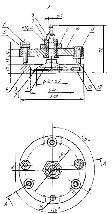 Срок действия с 01.07.91 до 01.07.97 Настоящий стандарт распространяется на каменноугольный пек, получаемый при переработке каменноугольной смолы, и устанавливает метод определения массовой доли веществ, не растворимых в хинолине (α1-фракции), диэлектрическим методом. Диапазон измерения массовой доли веществ, не растворимых в хинолине, от 5 до 14 %. Метод основан на зависимости диэлектрической проницаемости от содержания веществ, не растворимых в хинолине (α1-фракции), в каменноугольном пеке. 1. ОТБОР ПРОБ1.1. Отбор проб пека - по ГОСТ 5445. 1.2. Подготовка проб - в соответствии с требованиями ГОСТ 10200. Из средней лабораторной пробы пека с размером частиц менее 3 мм отбирают фракцию крупностью 1 - 3 мм и фракцию менее 0,25 мм. Первую фракцию крупностью 1 - 3 мм используют для определения емкости ячейки с пробой пека диэлектрическим методом. Вторую фракцию крупностью не более 0,25 мм используют для определения массовой доли веществ, не растворимых в хинолине, в соответствии с ГОСТ 10200 для определения градуировочной характеристики. 2. АППАРАТУРА, ПОСУДА, РЕАКТИВЫУстановка для определения веществ, не растворимых в хинолине, в комплект которой входят: измеритель емкости от 10 до 100 пФ (частота 103 Гц) класса точности не ниже 1; ячейка (черт. 1), состоящая из двух плоскопараллельных дисковых электродов. Допускается использовать ячейки других конструкций с теми же метрологическими характеристиками; Ячейка для определения веществ, не растворимых в хинолине 1 - электрод; 2 - шаблон № 1; 3 - шаблон № 2; 4 - плита нижняя; 5 - гайка М 6,5 по ГОСТ 5929; 6 - болт; 7 - втулка; 8 - гайка М 8,5 по ГОСТ 5929; 9 - гайка М 20´1,5; 10 - плита верхняя; 11 - втулка; 12 - направляющая; 13 - контакт; 14 - винт М 3´8,58 Черт. 1 шаблон № 1 (с отверстием) (черт. 2); шаблон № 2 (без отверстия) (черт. 2). Допускается использование одного шаблона диаметром (55 ± 0,5) мм, соответствующего шаблону, изображенному на черт. 2, или шаблона № 1 с прокладкой из любого материала толщиной 0,1 мм. Шаблоны 1 - шаблон № 1; 2 - шаблон № 2 Черт. 2 Весы лабораторные общего назначения типа ВЛР-1 или другие с теми же метрологическими характеристиками. Шкаф сушильный электрический, обеспечивающий нагрев до 160 °С. Термометр ртутный стеклянный с диапазоном измерения от 0 до 200 °С и ценой деления 1 °С. Шпатель или другое приспособление из некорродирующего материала для взятия навески. Ступка фарфоровая с пестиком вместимостью 250 см3 или другой измельчитель, не загрязняющий пробу при истирании. Стакан В-1-50 по ГОСТ 25336. Скальпель. Тестер или контрольная лампа. Толуол технический. Вентилятор бытовой. Сита для подготовки проб по ТУ 79 РСФСР 276 или изготовленные из сеток по ГОСТ 3306 или ГОСТ 6613. Холодильник бытовой с морозильной камерой. Допускается применение других средств измерения с метрологическими характеристиками и оборудования с техническими характеристиками не хуже, а также реактивов по качеству не ниже указанных в настоящем стандарте. 3. ПОДГОТОВКА К АНАЛИЗУ3.1. Подготовка ячейки 3.1.1. Ячейку собирают в соответствии с черт. 1 и устанавливают межэлектродное расстояние (1,5 мм) следующим образом: на нижнюю плиту кладут три шаблона № 1 (с отверстиями), электрод в сборе с верхней плитой устанавливают на шаблоны таким образом, чтобы направляющие вошли в отверстие нижней плиты. Опорные болты 6 верхней плиты не должны при этом касаться нижней плиты. Присоединив один контакт тестера и