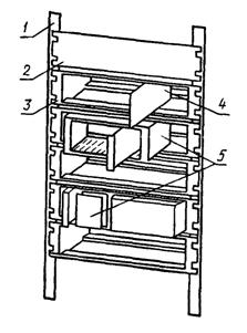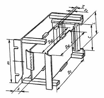1 - стойка вертикальная; 2 - панель; 3 - блочный каркас; 4 - печатная плата; 5 - вдвижной частичный каркас Черт. 1 Примечания: 1. Блочные каркасы, в общем случае, имеют соединители прямого или косвенного сочленения, устанавливаемые на задней стороне, и направляющие, обеспечивающие введение печатных плат или вдвижных частичных каркасов в заданное положение. 2. Элементы, как правило, установлены на правой стороне печатной платы, если смотреть с передней стороны блочного каркаса. 3. Разд. 8 определяет размеры, необходимые для обеспечения взаимозаменяемости вдвижных частичных каркасов. 4. ОПИСАНИЕ БЛОЧНОГО КАРКАСАДля примера применения настоящего стандарта на черт. 2 изображен типичный блочный каркас, который содержит горизонтальные элементы, заключенные между двумя боковыми стенками. Боковые стенки имеют прямоугольные фланцы, размеры которых соответствуют размерам ширины панелей по ГОСТ 28601.1. 5. ОПИСАНИЕ ВДВИЖНОГО ЧАСТИЧНОГО КАРКАСАВдвижные частичные каркасы могут быть различных типов, как показано на черт. 1, 3 и 4. Обычно вдвижные частичные каркасы содержат печатную плату с соединителем (соединителями) или без соединителя, рукоятку (рукоятки), извлекатель (извлекатели), переднюю панель, заднюю панель, опорные направляющие и кожухи. В состав вдвижного частичного каркаса могут входить несколько вдвижных каркасов разных типов. 6. ОСНОВНЫЕ РАЗМЕРЫ БЛОЧНЫХ КАРКАСОВРазмеры блочного каркаса приведены на черт. 2 и в табл. 1. Основные размеры блочного каркаса
