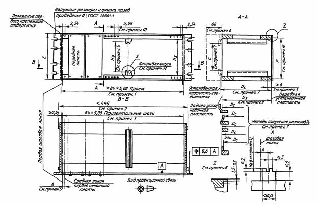 задней установочной плоскости на величину 7. Размеры DC и С и допуски на эти размеры зависят от типа выбранного соединителя (см. разд. 8). 8. Уточнение конструкции, показанное на выносном элементе Z сечения панели, предпочтительно для новых разработок. При разработке горизонтальных элементов следует обращаться к выносному элементу Y, черт. 3. 9. Выбирают один из четырех вариантов глубин. При