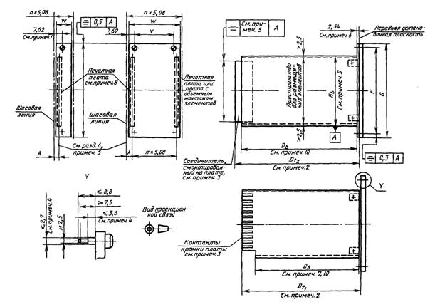 Черт. 3 Примечания к черт. 3: 1. Для установки панели номинальной ширины 2. Размеры Dt1 и Dt2 являются контрольными, обеспечивающими надежный контакт соединителей, и зависят от типа выбранного соединителя. 3. Установка соединителей - согласно разд. 8. 4. Максимальный размер по выбранной системе расположения передней панели и (или) расположения крепежных винтов. Указанное стандартом крепление винтами М2,5 не исключает возможности применения других систем крепления по согласованию с заказчиком. 5. Размер зависит от особенностей выбранного типа соединителя. Позиционные допуски должны назначаться, исходя из типа выбранного соединителя и его установки (см. п. 8.1). 6. Только номинальный размер. 7. Габаритным размером глубины печатной платы является размер Db, указанный в табл. 2, плюс длина выступа контактной кромки платы, которая зависит от типа выбранного соединителя. 8. Толщина печатных плат, устанавливаемых во вдвижной частичный каркас, равна (1,6 ±0,2) мм. 9. Размеры Нb ряда 1 табл. 2 являются предпочтительными для печатных плат вдвижных частичных каркасов. 10. При необходимости допускается увеличение