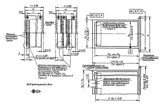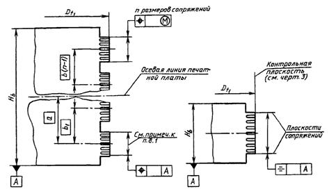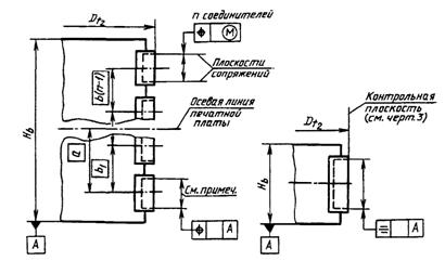 Черт. 7 Основные размеры для черт. 6 и 7: а, b1, b(n-1) - размеры, определяющие расположение соединителей на печатной плате; а - расстояние между осевой линией печатной платы и осевой линией первого соединителя; b1 - расстояние между осевыми линиями первого и второго соединителей; b(п - 1) - расстояние между осевыми линиями двух соседних соединителей; п - число соединителей. Примечание. Следует указывать выбранный размер или стандарт на соединители. В случае, если размер сопряжения частей соединителя зависит от типа соединителя, следует указывать количество контактов. 8.2. Расположение соединителя на блочном каркасе При изготовлении блочных каркасов следует устанавливать размеры крепления соединителя выбранного типа таким образом, чтобы их положение соответствовало стандартизованному положению соединителя на плате и чтобы введение вдвижного частичного каркаса было возможно без регулировки под приборный соединитель. Позиционные допуски соединителей, монтируемых на блочном каркасе, можно подобрать, исходя из требований к допускам, согласно п. 8.1 и черт. 6, 7. ПРИЛОЖЕНИЕ 1
