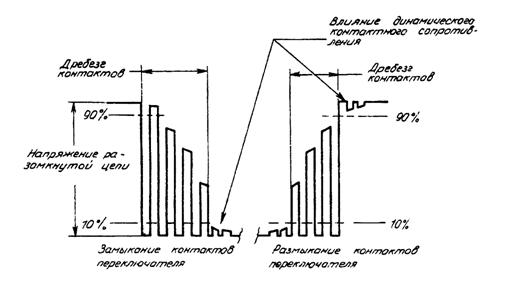 Черт. 1 Значения испытательного напряжения постоянного тока и испытательного тока должны быть указаны в ТУ, но не должны превышать значения напряжения разомкнутой цепи, равного 6 В постоянного тока и испытательного тока 100 мА. Устройство индикации и регистрации (осциллограф или аналогичный прибор), используемое в схеме, должно иметь полосу пропускания, равную 1 МГц или более, погрешность развертки напряжения ±5 % и показывать неподвижное состояние контактов до их перемещения. Переключатель должен приводиться в действие при постоянной скорости с частотой переключения, указанной в ГТУ. Если на дребезг контактов влияет усилие переключения, то предельные значения этого усилия должны быть указаны в ТУ. За время дребезга контактов принимают максимальное значение любого из пяти последовательных измерений замыкания и размыкания контактов. При данном испытании контакты являются разомкнутыми при падении напряжения на контактах не менее 90 % напряжения разомкнутой цепи. Контакты являются замкнутыми при падении напряжения на контактах не более 10 % напряжения разомкнутой цепи. При замкнутых контактах колебание напряжения в пределах 10 % вызывается колебанием динамического сопротивления контакта. Время дребезга контактов - это время, измеренное с момента первого замыкания (или размыкания) контактов до момента устойчивого замыкания (или размыкания) контактов (см. черт. 2). Требование. Значение времени дребезга контактов должно быть в пределах, указанных в ТУ. 4.4. Измерение сопротивления4.4.1 Измерение сопротивления контакта в милливольтовом диапазоне Цель. Определить полное электрическое сопротивление токопроводящих коммутируемых цепей, включая выводы переключателя, при напряжении, не оказывающем электрического влияния на материал контактов. Метод. Измерение следует проводить в соответствии с методикой испытания 2а по ГОСТ 28381 (МЭК 512-2, испытание 2а). Должны соблюдаться следующие условия: а) на каждой коммутируемой цепи должен быть проведен один измерительный цикл; b) если сопротивление контакта зависит от усилия переключения, то его следует измерять при условии переключения, указанном в ТУ. Требование. Сопротивление контакта должно быть в пределах, указанных в ТУ. Типовая кривая, изображающая дребезг контактов