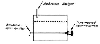 Черт. 4 c) испытательная камера должна быть наполнена свежей водопроводной водой до уровня (150 ±50) мм выше установленного переключателя. Общее давление в испытательной камере должно постепенно увеличиваться со скоростью 1 кПа/мин до достижения требуемого давления; d) перепад между давлением внутри испытательной камеры и внешним атмосферным давлением должен быть (105 ±5) кПа, если иное не установлено. Если установлено иное, то рекомендуется значения выбирать из ряда: (10 ±0,5); (20 ±1,0), (45 ±1,0), (350 ±10) кПа; e) установленный перепад давления следует поддерживать в течение 30 мин. В течение этого времени переключатели с подвижными уплотнениями должны быть подвергнуты 25 циклам переключений; f) после испытания корпус переключателя должен быть открыт с тем, чтобы проверить, не просачивалась ли вода в корпус переключателя. Требование. Во время испытания вода не должна просачиваться через уплотнения в месте установки переключателя на панели. 4.15. Герметичность корпуса переключателяДля защиты контактов и испытательного механизма переключатель может иметь герметичный корпус, защищенный от загрязнения или попадания влаги или позволяющий поддерживать постоянное внутреннее давление. Испытания на проверку герметичности корпуса переключателя служат для проверки способности корпуса переключателя обеспечивать установленную степень герметичности. 4.15.1. Водонепроницаемость при погружении Цель. Проверить способность корпуса переключателя защищать внутренний механизм переключателя при его погружении в воду. Метод. Испытание следует проводить в соответствии с испытанием OF по ГОСТ 28210 (МЭК 68-2-17, испытание OF). Должны соблюдаться следующие условия: a) испытание должно быть проведено при перепаде давления 14,7 кПа или при высоте уровня воды 1,5 м; b) продолжительность испытания должна быть 10 мин - для испытания на утверждение соответствия требованиям ТУ и 1 мин - для испытания на контроль соответствия качества; c) появление во время испытаний постоянного потока пузырьков воздуха, выходящих из переключателя, означает отказ. Допускается появление пузырьков воздуха на поверхности переключателя; d) после испытаний на утверждение соответствия качества корпус переключателя должен быть открыт и проверен на наличие воды. Требование. Во время испытания не допускается появление постоянного потока пузырьков воздуха, выходящих из переключателя. Вода не должна просачиваться в корпус переключателя - это проверяют после испытания при открытом корпусе. 4.15.2. Газонепроницаемость или герметичность высокой степени Цель. Проверить способность корпуса переключателя защитить внутренний механизм переключателя от проникновения газов при помощи подвижных уплотнений или герметичных уплотнений. Метод. Испытание следует проводить в соответствии с методикой испытания Qk по ГОСТ 28210 (МЭК 68-2-17, испытание Qk). Должны соблюдаться следующие условия: a) масс-спектрометр - индикатор утечки должен быть соединен с внутренней полостью переключателя при помощи соответствующего устройства, (например посредством отводной трубки) и внутри переключателя должен быть создан вакуум. Затем переключатель должен быть подвергнут воздействию гелия (переключатель должен быть окружен гелиевой средой). Если в переключателе есть дефект, то газ, количество которого зависит от размера дефектного уча