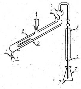 1 - сливной кран; 2 - аппарат для дистилляции; 3 - вход пара; 4 - каплеотбойник; 5 - выход из холодильника; 6 - вход в холодильник; 7 - коническая колба на 100 см3