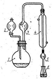 1 - круглая плоскодонная колба вместимостью 1 дм3; 2 - капельная воронка вместимостью 100 см3; 3 - каплеуловитель (насадка Кьельдаля); 4 - холодильник с прямой трубкой; 5 -стеклянная трубка длиной 200 мм с шариковым расширением; 6 - колба-приемник вместимостью 250 см3
