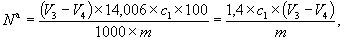 где V3 - объем раствора щелочи, израсходованный на титрование при проведении контрольного опыта, см3; V4 - объем раствора щелочи, израсходованный на титрование при проведении определения, см3; 14,006 - относительная атомная масса азота; с1 - концентрация раствора щелочи, моль/дм3; m - масса навески пробы, г». (ИУС № 5 2000 г.)