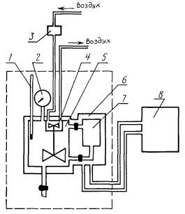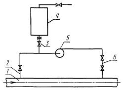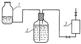 Дата введения 01.07.91 Настоящий стандарт устанавливает метод определения давления насыщенных паров в нефтях, летучих невязких нефтепродуктах и моторных топливах. Метод заключается в измерении давления насыщенных паров испытуемых продуктов при температуре (37,8 ± 0,1) °С и соотношении объемов, занимаемых испытуемым нефтепродуктом и его парами, 1:4, с предварительным диспергированием анализируемой пробы в аэрозольное состояние. Требования настоящего стандарта являются обязательными. 1. АППАРАТУРА, РЕАКТИВЫ И МАТЕРИАЛЫАппарат типа «Вихрь» (черт. 1). Схема аппарата «Вихрь» 1 - термометр; 2 - манометр; 3 - редуктор для регулировки расхода воздуха; 4 - диспергирующее устройство; 5 - воздушная камера; 6 - термостатирующая рубашка; 7 - топливная камера; 8 - термостат Черт. 1 Термостат жидкостной любой марки, обеспечивающий поддержание температуры 37,8°С с точностью ± 0,1 °С. Термометры типов ТН-6 по ТУ 92.887.019 и ТЛ-4 № 2 по ТУ 25.2021-003. Манометры по ГОСТ 2405 с пределами измерений: 60 кПа (0,6 кгс/см2) - для нефтепродуктов с давлением насыщенных паров от 0 до 40 кПа; 100 кПа (1 кгс/см2) - для нефтепродуктов с давлением насыщенных паров свыше 40 до 100 кПа; 160 кПа (1,6 кгс/см2) - для нефтепродуктов с давлением насыщенных паров свыше 100 кПа до 160 кПа; 250 кПа (2,5 кгс/см2) - для нефтепродуктов с давлением насыщенных паров свыше 160 кПа. Шланги резиновые с внутренним диаметром 5 - 8 мм. Секундомер любого типа, обеспечивающий измерение с точностью не менее 0,2 с. Устройство для заполнения топливной камеры (черт. 3). Баня, обеспечивающая охлаждение топливной камеры, пробоотборника с пробой и сосуда с хлористым натрием. Редуктор или ротаметр воздушный любого типа, обеспечивающий регулировку давления от 0 до 200 кПа. Воздух технический из баллона или от компрессора любого типа. Нефрас С2-80/120, С3-80/120 по ТУ 38.401-67-108, нефрас С50/170 по ГОСТ 8505, бензин прямой перегонки или петролейный эфир. Натрий хлористый по ГОСТ 4233 или ГОСТ 13830*, насыщенный раствор. Лед. Вода дистиллированная с рН 5,4 - 6,6. * На территории Российской Федерации действует ГОСТ Р 51574-2000. 2. ОТБОР ПРОБ2.1. Пробы отбирают по ГОСТ 2517, объем пробы не менее 500 см3. 2.2. Пробу хранят при температуре не выше 20 °С. Не допускается проводить испытания на пробе, подвергавшейся другим испытаниям. 2.3. Испытуемую пробу, топливную камеру и насыщенный раствор хлористого натрия, используемый для заполнения топливной камеры, охлаждают не менее 30 мин в охладительной бане при температуре от 0 до минус 4 °С. Примечание. При анализе продуктов из трубопровода допускается отбирать пробы непосредственно в топливную камеру аппарата (черт. 2). Схема отбора проб из трубопровода 1 - трубопровод; 2 - пробозаборное устройство; 3 - кран для ручного отбора пробы; 4 - топливная камера аппарата; 5 - насос; 6 - отборный клапан Черт. 2 3. ПОДГОТОВКА К ИСПЫТАНИЮ3.1. Аппарат «Вихрь» устанавливают в вытяжном шкафу или на лабораторном столе с выводом паров в вытяжной шкаф. 3.2. Устанавливают на аппарате пружинный манометр и ртутный термометр. 3.3. К аппарату через воздушный редуктор подключают линию сжатого воздуха и устанавливают давление от 0,14 до 0,20 МПа. 3.4. Аппарат подключают к термостату и устанавливают в воздушной камере температуру (37,8 ± 0,1) °С. 3.5. Аппарат проверяют на герметичность в соответствии с инструкцией по эксплуатации подачей сжатого воздуха. Аппарат считают герметичным, если давление в системе не меняе