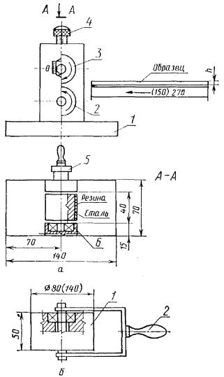 на резиновые 1. МЕТОД ОТБОРА ОБРАЗЦОВ1.1. Образец, предназначенный для испытания, представляет собой склеенные мягкую и жесткую подложки. Мягкая подложка - гибкие пленочные материалы с модулем упругости от 10-2 до 102 МПа и толщиной от 10 до 1000 мкм: поливинилхлорид (пластифицированный, непластифицированный, армированный тканью), полиэтилен, армированный полиэтилен, полипропилен, полиэтилентерефталат, полиуретан, целлофан, фторопласт, бумага, фольга (алюминиевая, медная) и др. Модуль упругости определяют по ГОСТ 9550. Жесткая подложка - жесткие листовые и плоские металлические и неметаллические материалы толщиной от 1,5 до 10,0 мм: сталь, алюминий, медь, латунь, титан, молибден и другие металлы, дерево, керамика, графит, пластмассы, бетонные плиты, фанера, картон и др. Предпочтительная толщина жесткой подложки из стали, алюминия, латуни, меди, титана, молибдена и других металлов - 1,5 - 3,0 мм, из дерева, пластмассы - 1,5 - 10 мм, керамики, графита, фанеры - 3 - 10 мм, картона - 1,5 - 3,0 мм. В качестве жесткой подложки используют также бетонные плиты толщиной 8 - 10 мм. Заготовки мягких и жестких подложек вырубают или вырезают из материалов, отвечающих требованиям, указанным в нормативно-технической документации на них. Полимерный клей должен отвечать требованиям, указанным в нормативно-технической документации на него. 1.2. Общий вид и размеры подложек и образца для испытания приведены в приложении 1. 1.3. Подложки должны иметь гладкую ровную поверхность без вмятин, сколов, трещин и видимых дефектов. Кромки мягкой подложки должны быть ровными, без повреждения. 1.4. На подготовленные поверхности подложек наносят полимерный клей. Подготовку поверхности склеивания, количество полимерного клея, наносимого на поверхности подложек, продолжительность их хранения, способ нанесения, условия сушки подложек устанавливают в нормативно-технической документации на полимерный клей. 1.5. Для формирования клеевого шва, обеспечения его равномерности по толщине по всей длине склеиваемой поверхности, а также устранения непроклеев склеенный образец пропускают через прорезь специального приспособления (приложение 2). В зависимости от толщины склеиваемых материалов и клеевого шва в приспособлении изменяют расстояние между подпружиненными валиками таким образом, чтобы в результате прохода образца через зону формирования в клеевом шве не создавалось дополнительное напряжение вследствие взаимного сдвига склеиваемых подложек. Допускаемое давление при формировании клеевого шва - от 0,7 до 1,0 МПа или указано в нормативно-технической документации на полимерный клей. Для формирования клеевого шва может быть использован ручной стальной каток массой 3 кг при толщине материалов до 100 мкм и массой 6 кг при толщине материалов до 1000 мкм (приложение 2). При этом катком прокатывают по образцу в обоих направлениях продольной оси его не менее 3 раз. 1.6. Склеенный образец после формирования клеевого шва выдерживают при температуре (23 ± 2) °С в течение 24 ч или в условиях, указанных в нормативно-технической документации на полимерный клей. 1.7. Образец не должен иметь клеевые подтеки по кромке клеевого шва. При их наличии допускается зачищать кромки образца. Смещение размеров подложек по ширине склеивания не должно быть более 0,5 мм. 1.8. Толщину, длину, ширину подложек и склеенных образцов измеряют при п