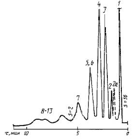 При использовании хроматографов других типов или других твердых носителей допускается изменять условия проведения анализа бензинов, указанные в табл. 1, но при этом бензол должен элюироваться после додекана, а четкость разделения углеводородов должна быть не хуже чем на приведенных хроматограммах (черт. 1). Хроматограммы бензина АИ-92 и внутреннего стандарта (додекан) Фаза ГЦЭГ Фаза OV-275 1 - неароматические углеводороды; 2а - додекан; 2 - бензол; 3 - толуол; 4 - этилбензол, n-, м-ксилол; 5, 6 - о-ксилол, ароматические углеводороды C9; 7 - 13 - ароматические углеводороды С9- С10 4.3. Хроматограммы рассчитывают с помощью интегратора или ручным способом. 5. ОБРАБОТКА РЕЗУЛЬТАТОВ5.1. Определение поправочных коэффициентов 5.1.1. Для установления поправочных коэффициентов чувствительности детектора к углеводородам относительно стандарта (бензола), поправочный коэффициент для которого принимается равным 1, готовят три - пять калибровочных смесей, имитирующих анализируемый бензин. Например, готовят смесь следующего состава в процентах (по массе): - алкилат (или бензин деароматизированный) 50 - 45 - нонан 4 - 5 - декан 1 - 2 - бензол 5 - 2 - толуол 7 - 10 - этилбензол 3 - 4 - n-ксилол 5 - 4 - м-ксилол 15 - 20 - о-ксилол 5 - 4 - ароматический углеводород С9 100-ΣСi, где ΣСi - сумма массовых долей предыдущих компонентов в смеси, %. Анализ смеси проводят при условиях, указанных в табл. 1. Поправочный коэффициент чувствительности детектора к углеводороду (Ki) вычисляют по формуле