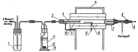1 - ртуть; 2 - жаростойкая пробка; 3 - трубка-приемник; 4 - печь; 5 - резиновая втулка; 6 - кварцевый толкатель; 7 - опора для трубки; 8 - лодочка; 9 - термопара; 10 - трубка для сжигания; 11 - раствор перекиси водорода; 12 - диск из пористого стекла (размер пор 15 - 40 мкм); 13 - склянка для очистки газа 5. ПОДГОТОВКА ПРОБЫДля определения хлора используют аналитическую пробу, измельченную до прохождения через сито с отверстиями размером 200 мкм (см. приложение). При необходимости перед определением пробу распределяют тонким слоем и выдерживают в течение минимального времени, которое необходимо для установления приблизительного равновесия между влажностью пробы и влажностью атмосферы в лаборатории. Перед началом определения воздушно-сухую аналитическую пробу тщательно перемешивают в течение 1 мин, предпочтительно механическим способом. 6. ПРОВЕДЕНИЕ АНАЛИЗАТемпературу печи поднимают до 1250 или 1350 °С. Взвешивают около 0,5 г пробы с точностью до 0,1 мг, помещают в лодочку для сжигания и равномерно распределяют по дну лодочки. Если определение проводят при 1250 °С, то пробу покрывают около 0,5 г каолина (п. 3.1) или 0,15 г фосфата железа (III) (п. 3.2); если определение проводят при 1350 °С, то пробу покрывают около 0,5 г оксида алюминия (п. 3.3) (см. примечание 1). Отмеряют 100 см3 раствора перекиси водорода (п. 3.4) и делят это количество между двумя поглотителями или наливают целиком в один поглотитель. Водяной насос регулируют так, чтобы через поглотитель (поглотители) проходил достаточно большой поток воздуха с постоянной скоростью, судя по регулятору давления. В трубку для сжигания вставляют трубку-приемник и укрепляют пробку. Скорость кислорода устанавливают около 300 см3/мин. Помещают загруженную лодочку в трубку для сжигания со стороны входного отверстия так, чтобы расстояние от ее центра до центра высокотемпературной зоны печи составляло 240 мм, закрывают входное отверстие трубки пробкой с толкателем и трубкой для подачи кислорода. В конце каждого из шести последующих одноминутных периодов проталкивают лодочку вперед на 40 мм, всякий раз отводя толкатель назад для предотвращения его разрушения. После последнего перемещения лодочка должна находиться в центре высокотемпературной зоны (см. примечание 2). Оставляют ее там на 4 мин. Поглотитель (поглотители) отсоединяют и лодочку извлекают и помещают на подставку из асбеста. Промывают трубку-приемник, собирая промывные воды в один поглотитель или в первый из двух поглотителей; содержимое поглотителя (поглотителей) переносят в коническую колбу вместимостью 250 см3, затем промывают поглотитель (поглотители), собирая промывные воды в ту же колбу. Добавляют 2 или 3 капли раствора смешанного индикатора и титруют раствором тетрабората натрия (п. 3.6). Результат соответствует общей кислотности раствора, образующейся за счет хлора и оксидов серы, согласно следующим реакциям: SO2 + Н2О2 → H2SO4 Сl2 + Н2О2 → 2НСl + О2. После титрования хлорид-ион присутствует в виде хлорида натрия. Добавляют 20 см3 раствора оксицианида ртути (II) (п. 3.5) (с достаточным избытком для проб, содержащих до 1,2 % хлора) для превращения хлорида натрия в гидроксид натрия: NaCl + Hg(OH)CN → HgClCN + NaOH. Выделяющуюся щелочь титруют раствором серной кислоты. Примечания: 1. Использование такого покрывающего материала, как тонкоизмельченный оксид алюминия, предотвращает быстрое разложение пробы, выб
