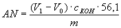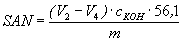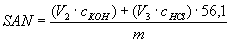 где V1 - объем раствора гидроокиси калия, израсходованный на титрование испытуемой массы, см3; V0 - объем раствора гидроокиси калия, израсходованный на титрование контрольного раствора, см3; cКОН - концентрация стандартного раствора гидроокиси калия, моль/дм3; т - масса для испытания, г. 11.1.2. Кислотное число сильных кислот (SAN), выраженное в миллиграммах КОН на граммы, вычисляют по формулам, приведенным в пп. 11.1.2.1 и 11.1.2.2. 11.1.2.1. Если контрольное титрование проводят кислотой,