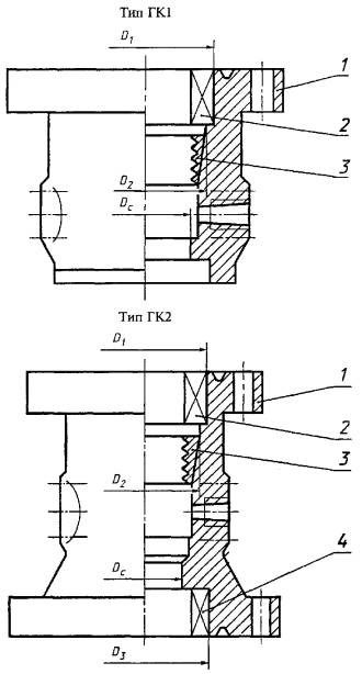 4.2.3 Трубодержатель колонной головки должен быть рассчитан на нагрузку, передаваемую обсадной колонной, закрепленной в трубодержателе, а в случае его конструктивного объединения с верхним уплотнителем - также и на восприятие усилий от давления скважиной среды на верхний уплотнитель. При этом вызываемая им деформация, приводящая к уменьшению внутреннего диаметра обсадной трубы, закрепленной в трубодержателе, не должна препятствовать прохождению через нее шаблона для проверки ее внутреннего диаметра. а) от полной массы обсадной колонны; б) от веса обсадной колонны с наибольшей толщиной стенки для рассматриваемого условного диаметра, за вычетом выталкивающей силы гидростатического столба жидкости в скважине; в) по другой методике, используемой изготовителем. 4.2.4 Условные обозначения колонных головок - по приложению В. 4.3 Присоединительные размеры 4.3.1 Фланцы колонных головок должны соответствовать ГОСТ 28919. 4.3.2 Резьба нижнего присоединительного резьбового конца корпуса однофланцевой колонной головки должна соответствовать короткой треугольной резьбе обсадных труб по ГОСТ 632. По требованию заказчика может быть изготовлена резьба другого типа (другое соединение) по ГОСТ 632 или по иному стандарту. 4.3.3 Корпуса колонных головок должны иметь по два соосных боковых отвода, имеющих присоединительные элементы в виде резьбы по ГОСТ 633 или в виде фланцев. 4.3.4 Наибольшие диаметры расточки верхнего стволового фланца D1 и трубодержателя D2 приведены в таблице 4. Таблица 4 - Диаметры расточки верхнего фланца Размеры в миллиметрах