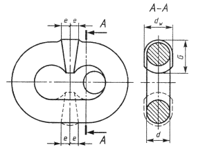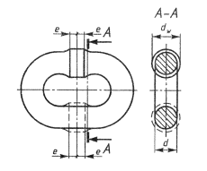 4.2. Диаметр материала 4.2.1. Предельные отклонения диаметра материала Предельные отклонения диаметра материала в готовом звене (кроме места сварки) должны составлять: для для 4.2.2. Отклонение размеров в месте сварки Размеры в месте сварки dw (см. рисунок 1 и таблицу 1) должны быть не менее диаметра вблизи места сварки и не более: 10 % d в любом направлении - для исполнения 1; 20 % d в направлении, перпендикулярном к плоскости звена, и 20 % d в других направлениях - для исполнения 2; 20 % d для размера dw в направлении, перпендикулярном к плоскости звена, и 35 % d для размера G при измерении в других направлениях - для исполнения 3. Примечание - Ограничение наибольшего фактического размера звена цепи в месте сварки обеспечивает исключение в эксплуатации для исполнений 1, 2, 3 таких дефектов, как образование петель (узлов) в цепи и защемление звеньев за счет сохранения необходимых зазоров. 4.2.3. Область допускаемого изменения размеров после сварки Изменение размеров после сварки должно распространяться на расстояние е ≤ 0,6 dn в каждую сторону от середины звена. 4.3 Длина и ширина звена Размеры по длине и ширине звена должны соответствовать указанным в таблице 1 (рисунок 2).