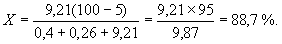 ПРИЛОЖЕНИЕ Б(справочное) Примеры вычисления результатов анализаПример 1. Определение массовой доли фракции Необходимо рассчитать массовые доли фракций глинозема 63 - 20, 20 - 10 и 10 - 0 мкм. Для этого находят логарифмы измеренных значений светопропускания для каждой из трех выбранных фракций. Допустим, что светопропускание будет соответствовать следующим значениям: для фракции 63 - 0 мкм A0 = 36; » » 20 - 0 » A1 = 60; » » 10 - 0 » A2 = 64; » » 0 » A = 72. Логарифмы этих величин соответственно 1,556; 1,778; 1,805; 1,858. Рассчитывают разность логарифмов светопропускания для диаметров частиц верхнего и нижнего пределов фракции в выбранном интервале крупности. В данном случае это: для фракции 63 - 20 мкм lgA1 - lgA0 = 1,778 - 1,556 = 0,222; » » 20 - 10 мкм lgA2 - lgA1 = 1,805 - 1,778 = 0,027; » » 10 - 0 мкм lgA - lgA2 = 1,858 - 1,805 = 0,053. Рассчитывают средний диаметр (dср) для каждой из выбранных фракций: для фракции 63 - 20 мкм dср = (63 + 20)/2 = 41,5 мкм » » 10 - 0 мкм dср = (10 + 0)/2 = 5 мкм. Умножив значение dср на соответствующую разность логарифмов, находят относительную массу каждой фракции: V63-20 = 41,5 × 0,222 = 9,21; V20-10 = 15 × 0,027 = 0,4; V10-0 = 0,53 × 5 = 0,26. Значение относительных масс суммируют и определяют массовую долю каждой фракции с учетом массовой доли отсева (C). При C = 5 % массовая доля в процентах для фракции 63 - 20 мкм составит
