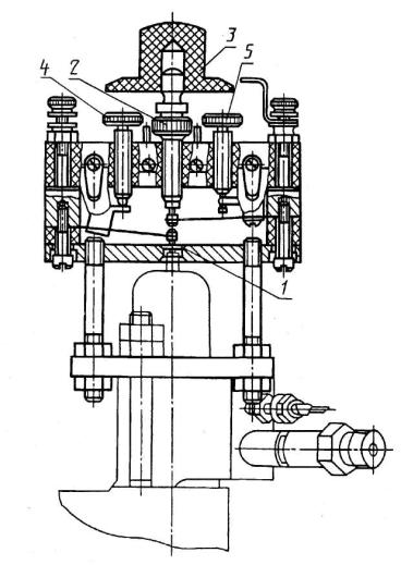 где ε - степень сжатия; VП - рабочий объем цилиндра, равный 652 см3; VВМТ - объем воды, залитой в камеру сгорания, см3; Vx - объем воды, вытесняемый концом индикатора воспламенения, равный 3,2 см3. По значениям показаний микрометра и соответствующим им значениям степени сжатия строят график их зависимости. 2.1, 2.2. (Измененная редакция, Изм. № 2). 2.3. Установка угла опережения впрыска топлива 2.3.1. В процессе испытания различных топлив устанавливают постоянный угол впрыска топлива, равный 13° до ВМТ в такте сжатия, что достигается регулированием угла подачи топлива. Возможность регулирования угла подачи топлива обеспечивается правильной установкой муфты сцепления насоса с валиком привода. (Измененная редакция, Изм. № 2). 2.3.2. Для правильной установки муфты сцепления насоса с валиком привода сцепления устанавливают расход топлива (13±0,5) см3/мин (рекомендуется товарное дизельное топливо), отсоединяют от насоса трубку высокого давления и соединяют диски муфты сцепления так, чтобы подъем мениска топлива в выходном штуцере насоса происходил при среднем положении рычага механизма изменения угла опережения впрыска топлива примерно за 35° до ВМТ в такте сжатия. (Измененная редакция, Изм. № 2, 4). 2.4. Проверка давления впрыска топлива Давление впрыска топлива проверяют следующим образом: вынимают форсунку из цилиндра с тем, чтобы впрыск топлива происходил в атмосферу. На линии, соединяющей топливный насос с форсункой, устанавливают прибор для определения давления впрыска топлива (максиметр). Показания максиметра устанавливают (10,4±0,4)·106 Па и запускают двигатель. Регулируют натяжение иглы форсунки так, чтобы впрыск топлива в атмосферу через форсунку и из отверстия максиметра происходил равными порциями. При такой регулировке давление впрыска топлива из форсунки будет соответствовать давлению (10,4±0,4)·106 Па, показываемому максиметром. Давление впрыска проверяют на товарном дизельном топливе при вращении двигателя от электромотора. 2.5. Регулировка индикатора впрыска 2.5.1. В регулировку индикатора впрыска включают предварительное регулирование и окончательную настройку. 2.5.2. Предварительное регулирование индикатора впрыска проводят до установки его на двигатель установлением натяжения пластинчатых пружин. Перед началом регулировки необходимо убедиться в том, что поверхности контактов тщательно зачищены и их соединения плотно затянуты. (Измененная редакция, Изм. № 4). 2.5.3. Окончательную настройку индикатора впрыска проводят на работающем двигателе. 2.6. Предварительная регулировка индикатора впрыска 2.6.1. Регулировочный винт 3 буферной пружины (черт. 1) ввертывают до отказа. Вращением центрального винта 2 выводят из соприкосновения контакты пластинчатых пружин. Вращением установочного винта 4 нижней пластинчатой пружины выводят ее из соприкосновения со штоком иглы форсунки. Отгибают нижнюю пластинчатую пружину так, чтобы зазор между нижней пластинчатой пружиной и штоком 1 иглы форсунки был 0,8 мм. Ввертывают установочный винт 4 нижней пластинчатой пружины до соприкосновения ее со штоком иглы, после чего ввертывают его еще на один оборот. Освобождают верхнюю пластинчатую пружину от натяжения, вращая установочный винт 5. В этом положении контакты должны соприкасаться. Если контакты не соприкасаются, то конец верхней пластинчатой пружины следует от