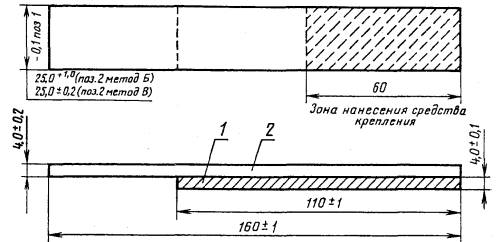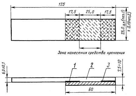 Дата введения 01.07.78, в части метода А - 01.07.79 Настоящий стандарт распространяется на резину, клей и устанавливает методы определения прочности связи их с металлом при отслаивании (А, Б и В). Сущность методов заключается в измерении силы, вызывающей отслаивание резиновой полоски от металлической пластины. При отслаивании по методу А сила действует перпендикулярно к плоскости пластины, по методам Б и В - параллельно плоскости пластины. Методы А и В предназначены для определения прочности связи при креплении резиновых смесей к металлу в процессе вулканизации. Метод Б предназначен для определения прочности связи при креплении вулканизованных резин к металлу. (Измененная редакция, Изм. № 2). 1. АППАРАТУРА1.1. Разрывная машина с силоизмерителем безынерционного типа, отвечающая требованиям ГОСТ 28840. Допускается проводить испытания на разрывной машине с инерционным (маятниковым) силоизмерителем. 1.1.1. Для проведения испытаний по методу А разрывная машина должна быть снабжена приспособлением, обеспечивающим установку испытуемого образца таким образом, чтобы в ходе испытания сила отслаивания действовала, по возможности, перпендикулярно к плоскости металлической пластины. Для проведения испытаний по методам Б и В разрывная машина должна быть снабжена зажимами, удерживающими металлическую пластину и резиновую полоску в процессе испытания. Один из вариантов приспособления приведен в приложении 1. (Измененная редакция, Изм. № 1). 1.1.2. Разрывная машина должна обеспечивать скорость движения подвижного зажима (50±5) мм/мин для метода А и (100±10) мм/мин для методов Б и В. 1.1.3. Для проведения испытаний при повышенных температурах разрывная машина должна быть снабжена тепловой камерой, отвечающей требованиям ГОСТ 28840. 1.2. Часы любой конструкции по нормативно-технической документации. 1.3. Термометры стеклянные технические по нормативно-технической документации с диапазоном измерения от 0 до 100 °С с ценой деления 1 °С и от 0 до 300 °С с ценой деления 2 °С. 1.4. Секундомер механический 3-го класса точности. Для контроля параметров допускается применять другие средства измерения с соответствующим диапазоном измерения и погрешностью, не превышающей указанную. 1.2-1.4. (Введены дополнительно, Изм. № 2). 2. ПОДГОТОВКА К ИСПЫТАНИЮ2.1. Образец для испытания представляет собой резиновую полоску, прикрепленную клеем или другим средством крепления к металлической пластине. Общий вид и размеры образцов для испытания указаны на черт. 1 для метода А и на черт. 2 для методов Б и В. 1 - металлическая пластина; 2 - резина; 3 - липкая лента Черт. 1 1 - металлическая пластина; 2 - резина Черт. 2 Для образцов по методам А и В за размеры резиновой полоски принимают соответствующие размеры гнезда пресс-формы. Для образца по методу Б за толщину резиновой полоски принимают толщину резиновой пластины, из которой изготавливают полоску, за ширину и длину полоски - соответствующие размеры штанцевого ножа, которым вырубают полоску. Для испытания по методу Б допускается использовать металлическую пластину толщиной (4,0±0,5) мм. Образцы для испытания не должны иметь недопрессовок, вырывов, отслоений от металла, перекосов, трещин резины и т.п. 2.2. Металлические пластины изготавливают из металла, отвечающего требованиям, указанным в нормативно-технической документации (НТД) на изделие. Пластины из металла