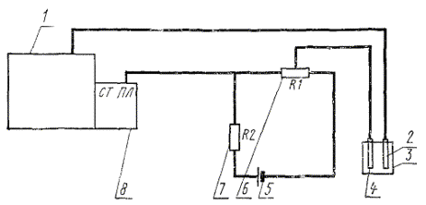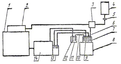 где Т - титр 0,02 н. раствора азотнокислого серебра, г/мл; 0,003397 - масса азотнокислого серебра, содержащаяся в 1 мл точно 0,02 н. раствора азотнокислого серебра, г. За величину поправочного коэффициента принимают среднее арифметическое трех определений, расхождения между которыми не должны превышать 0,003. 2.2. Подготовка установки для автоматического титрования Схема установки приведена на черт. 1. Установку включают за 15 мин до начала работы. Стеклянный и серебряный электроды включают в (гнезда Ст и Пл переходной коробки, соответственно. Вспомогательный электрод (хлор-серебряный или насыщенный каломельный) включают b соответствующее гнездо рН-метра-милливольтметра, помещают в стакан вместимостью 50 мл с насыщенным раствором азотнокислого аммония и соединяют электролитическим ключом с измерительными электродами, находящимися в испытуемом растворе в стакане для титрования. Склянку с раствором азотнокислого сере-бра присоединяют при помощи крана и резиновой трубки к клапану, который помещают так, чтобы его капилляр мог (свободно опускаться в стакан для титрования. При этом склянка должна быть выше клапана на 20 - 25 см. Схема установки автоматического титрования 1 - потенциометр электронный самопишущий ЭПП-09 М3; 2 - блок автоматического титрования БАТ-12ЛМ; 3 - клапан БАТ-12ЛМ; 4 - склянка с 0,02 н. раствором азотнокислого серебра; 5 - кран стеклянный; 6 - электрод серебряный; 7 - стакан для титрования; 8 - мешалка электромагнитная; 9 - электрод стеклянный; 10 - ключ электролитический; 11 - стакан с насыщенным раствором азотнокислого аммония; 12 - электрод вспомогательный; 13 - переходная коробка к рН-метру; 14 - лабораторный рН-метр-милливольтметр типа рН-340. Перед началом работы устанавливают необходимую скорость подачи раствора азотнокислого серебра. Для этого капилляр клапана опускают в бюретку, включают подачу раствора и как только мениск раствора коснется большого деления бюретки, включают секундомер. После подачи в (бюретку 0,5 мл раствора секундомер выключают и записывают время. Такую операцию повторяют 4 - 5 раз. Время должно совпадать и соответствовать 50 - 70 с. Скорость подачи раствора регулируют краном я винтом клапана. Затем проверяют при помощи секундомера скорость движения ленты диаграммы самописца ЭПП-09 М3 1 см ленты (одно деление) продвигается примерно за 15 с. Скорость