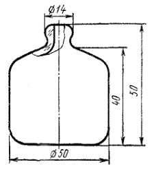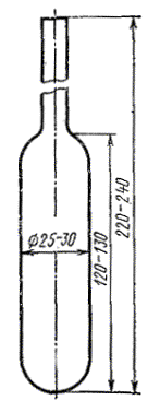 где 0,5 - объем 0,02 н. раствора азотнокислого серебра, мл; t1 -время продвижения 1 см ленты диаграммы самописца ЭПП-09 М3, с; t2 - время, за /которое вытекает 0,5 мл 0,02 н. раствора азотнокислого серебра, с. 3. ПРОВЕДЕНИЕ ИСПЫТАНИЯ3.1. Для испытания проводят омыление в ампулах или при помощи бомб прибора ЛСАРТ. 3.1.1. При омылении в ампулах 25 мл испытуемого бензина, предварительно определив его плотность денсиметрам, и 5 мл насыщенного спиртового раствора едкого кали наливают пипетками с резиновой грушей в ампулу (черт. 2), помещенную в фарфоровый стакан со льдом. Ампула для омыления Не удаляя ампулы из стакана со льдом, запаивают ее. Для этого открытый конец ампулы нагревают над пламенем горелки до размягчения при помощи нагретой стеклянной палочки, вытягивают в капилляр и запаивают (одну ампулу можно использовать несколько раз). После запаивания содержимое ампулы энергично встряхивают, заворачивают ее в (металлическую сетку (для предохранения от разбрасывания осколков в случае взрыва ампулы) и помещают в кипящую водяную баню. Нагревание проводят в течение 30 мин. При нагревании ампулу через каждые 7 - 8 мин встряхивают. После этого ампулу охлаждают, осторожно вскрывают, и содержимое количественно дистиллированной водой переносят в делительную воронку, далее испытание - по п. 3.1.3. 3.1.2. При омылении с помощью бомб прибора ЛСАРТ 20 г анализируемого бензина помещают в склянку прибора (черт. 3) и взвешивают с погрешностью не более ОД г. Затем прибавляют 10 мл насыщенного спиртового раствора едкого кали, склянку закрывают резиновой пробкой, обернутой фторопластовой пленкой и помещают в бомбу прибора ЛСАРТ. Склянка для омыления в бомбах прибора ЛСАРТ Перед испытанием бомбу проверяют на герметичность. Для этого в нее вносят 3 - 4 мл неэтилированного бензина, плотно закрывают ее крышкой и опускают на 5 мин в водяную баню, нагретую до 96 - 98 °C. Если на поверхности воды появляются пузыри, то затягивают крышку бомбы и снова проверяют герметичность. Бомбу со склянкой переносят в баню прибора ЛСАРТ, нагретую до 110 °С, и выдерживают при определении бромистого этила и дихлорэтана в течение 1 ч, при определении дибромэтана - в течение 2 ч. Во время нагревания содержимое бомбы встряхивают через каждые 20 мин. По истечении времени нагревания бомбу охлаждают и содержимое склянки переносят количественно в делительную воронку. 3.1.3. Делительную воронку закрывают пробкой, встряхивают в течение нескольких секунд и после разделения слоев сливают нижний слой в стакан для титрования. Затем в делительную воронку добавляют около 10 мл дистиллированной воды, одну каплю фенолфталеина, встряхивают Содержимое и после отстаивания сливают нижний слой в тот же стакан для титрования. Это повторяют до тех пор, пока нижний слой раствора в делительной воронке не будет давать щелочную реакцию с фенолфталеином. Затем содержимое стакана (подкисляют раствором азотной кислоты (1:2), добавляют еще 3 - 5 капель и кипятят на электроплитке 5 - 7 мин. После охлаждения стакан с раствором помещают на электромагнитную мешалку, доводят объем (раствора в стакане дистиллированной водой до 100 - 110 мл и титруют. 3.2. Титрование проводят при помощи самопишущего автоматического электронного потенциометра или ручным способом по скачку потенциала. 3.2.1. При титровании с помощью (автоматического потенциометра в стакан с ис