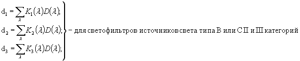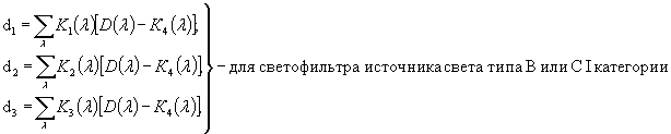 Если отклонения координат цветности ∆xв ∆yв или ∆xс ∆yс, определенные по формулам (12), превышают установленный допуск (табл. 3), толщины компонентов l1, l2, l3 светофильтров должны быть изменены на значения ∆ l1, ∆ l2, ∆ l3.