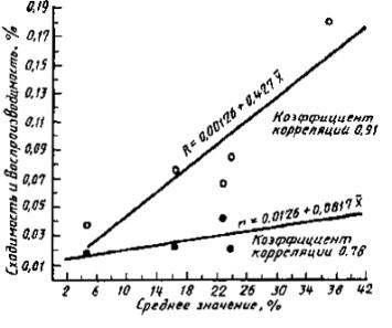 где т2 - масса тигля с золой, г; m1 - масса пустого тигля, г; m0 - масса навески, г. Точность расчета - не более 0,01 % от массовой доли. Повторяемость и воспроизводимость рассчитывают по двум линейным уравнениям: r = 0,016 + 0,0817 R = 0,00126 + 0,427 или определяют с помощью графика (см. чертеж). Полученные результаты указывают на наличие связи между повторяемостью, воспроизводимостью и средними значениями зольности. На графике на оси абсцисс отложено среднее значение зольности в процентах, а на оси ординат - сходимость и воспроизводимость в процентах. Зависимость сходимости и воспроизводимости от среднего значения величины зольности
