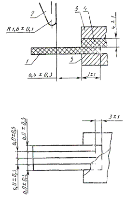 1 - образец; 2 - ударник; 3, 5 - верхняя и нижняя плиты зажима; 4 - резиновая прокладка (Измененная редакция, Изм. № 2, 3). 1а.1.3. Погрешность средства измерения температуры среды не должна превышать ±1 °С при температурах до минус 40 °С и ±1,5 °С - при температурах от минус 41 до минус 75 °С. Погрешность регулирования установившейся температуры среды не должна превышать ±1 °С. Чувствительный элемент средства измерения температуры среды должен быть расположен на уровне образца. (Измененная редакция, Изм. № 3). 1а.1.4. Испытания проводят на приборах марок ИМ-5001, 2046 ПХ-1 или других приборах с такими же метрологическими характеристиками, аттестованных в установленном порядке. (Измененная редакция, Изм. №3). 1а.2. Толщиномер индикаторный по ГОСТ 11358-89 с ценой деления 0,01 мм. 1а.3. Секундомер механический по ГОСТ 5072-79, 2-го класса точности, или другие средства измерения времени с погрешностью не более ±5 с. (Измененная редакция, Изм. №3). 1а.4. Спирт этиловый технический по ГОСТ 17299-78 или спирт этиловый ректификованный технический по ГОСТ 18300-87 (охлаждающая среда). 1а.5. Двуокись углерода твердая по ГОСТ 12162-77 или жидкая по ГОСТ 8050-85 или азот по ГОСТ 9293-74 (охлаждающие агенты). (Введены дополнительно, Изм. № 1). 1a.6. Линейка измерительная по ГОСТ 427-75 с ценой деления 1 мм. (Введен дополнительно, Изм. № 3), 2. ПРОВЕДЕНИЕ ИСПЫТАНИЯ2.1. Испытания проводят не ранее чем через 16 ч и не позднее чем через 28 сут после вулканизации. Допускается проводить испытания через другие промежутки времени, о чем указывают, в нормативно-технической документации на резины, резиновые изделия и методы их испытаний. Перед испытанием образцы или пластины, из которых их вырубают, кондиционируют при температуре (23 ± 2) °С не менее 1 ч. При кондиционировании образцы должны быть защищены от воздействия прямых солнечных лучей. (Измененная редакция, Изм. № 1). 2.1а. Измеряют толщину каждого образца в трех точках, принимая за результат среднее арифметическое значение. (Измененная редакция, Изм. № 1, 2). 2.2. Температуру охлаждающей среды криокамеры доводят до значения величины, близкой к ожидаемой температуре хрупкости испытуемой резины. Часть прибора, предназначенную для установки образцов, погружают в криокамеру и выдерживают при температуре испытания не менее 10 мин. (Измененная редакция, Изм. № 2). 2.3. Закрепляют в зажиме четыре образца и погружают в охлажденную до температуры испытания криокамеру. Уровень жидкости над образцами должен быть не менее 25 мм. Перед погружением образцов в криокамеру допускается ее охлаждение ниже температуры испытания настолько, чтобы после погружения температура в ней была равна температуре испытания. 2.4. Образцы выдерживают в течение (3,0 ± 0,5) мин, считая с момента установления заданной температуры. 2.3, 2.4. (Измененная редакция, Изм. № 1, 2). Образец считают разрушенным при наличии хотя бы одного из следующих признаков разрушения: разделения образца на части, наличия одной или нескольких трещин, расщепления, выкрашивания. При отсутствии признаков разрушения каждый образец изгибают вручную под углом 90° в направлении, в котором он подвергался деформированию в криокамере, и осматривают; при обнаружении признаков разрушения образец считают разрушенным. Допускается производить осмотр образцов и их изгиб, не вынимая из зажимов. При разрушении хотя бы одного из четырех образцов, испытанных при од