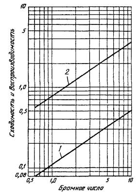 Примечание. Если расход раствора бромид-бромата превышает 10 см, при титровании может произойти разделение реакционной смеси на два слоя, что осложнит растворение пробы в растворителе, особенно при испытании проб с широким диапазоном температур кипения. Для повышения растворимости пробы добавляют небольшое количество бензола. 3. ПРОВЕДЕНИЕ ИСПЫТАНИЯ3.1. Каждое определение бромного числа начинают с проведения контрольного опыта по п. 3.2, используя вместо испытуемого раствора 5 см3 четыреххлористого углерода или 1,1,1-трихлорэтана. Расход бромид-бромата не должен превышать 0,1 см3. 3.2. В мерную колбу вместимостью 50 см3 наливают 10 см3 четыреххлористого углерода (1,1,1-трихлорэтана) и пипеткой добавляют пробу в соответствии с табл. 2. Массу пробы вычисляют по разности масс до и после добавления пробы с точностью до 0,001 г. Затем объем раствора в колбе доводят до метки четыреххлористым углеродом (1,1,1-трихлорэтаном) и перемешивают. 3.3. Титровальную ячейку охлаждают до температуры от 0 до 5 °С и поддерживают ее в процессе титрования. В титровальную ячейку наливают 110 см3 растворителя и включают мешалку. Частота вращения мешалки должна быть не менее 20 с-1. Включают титратор. Устанавливают стрелку титратора на отметку «нуль» и добавляют 1 или 2 капли раствора бромид-бромата, при этом стрелка прибора должна установиться на заданной конечной точке и остаться в таком положении не менее 30 с. 3.4. В титровальную ячейку пипеткой переносят 5 см3 раствора, приготовленного по п. 3.2, и тируют раствором бромид-бромата до тех пор, пока стрелка измерительного прибора не начнет отклоняться, после чего титрант добавляют по каплям. Титруют, пока стрелка не зарегистрирует заданную конечную точку и останется в данном положении не менее 30 с. 4. ОБРАБОТКА РЕЗУЛЬТАТОВ4.1. Бромное число выражают в граммах брома, присоединяющегося к 100 г нефтепродукта. 4.2. Бромное число испытуемой пробы (БЧ) вычисляют по формуле БЧ = (V1 - V2)с×0,0799×100/m, где V1 - объем раствора бромид-бромата, израсходованный на титрование аликвотной доли испытуемого раствора, см3; V2 - объем раствора бромид-бромата, израсходованный на титрование в контрольном опыте, см3; c - концентрация бромид-бромата, c (1/6KBr, KBrO3) = 0,5 моль/дм3; m - масса пробы, г; 0,0799 - количество брома, соответствующее 1,0 см3 0,1 моль/дм3 раствора тиосульфата натрия, г. 4.3. За результат испытания принимают среднее арифметическое результатов двух определений. Результат округляют до первого десятичного знака. 5. ТОЧНОСТЬ МЕТОДА5.1. Сходимость Два результата определений, полученные одним исполнителем, признаются достоверными (с 95 %-ной доверительной вероятностью), если расхождение между ними не превышает значения, приведенного на черт. 1 или 2 для среднего арифметического результата. ТОЧНОСТНЫЕ ХАРАКТЕРИСТИКИ РЕЗУЛЬТАТОВ ОПРЕДЕЛЕНИЯ ДЛЯ НЕФТЕПРОДУКТОВ, 90 % КОТОРЫХ ВЫКИПАЕТ ДО 205 °С 1 - сходимость; 2 - воспроизводимость Черт. 1 5.2. Воспроизводимость Два результата испытаний, полученные разными исполнителями, признаются достоверными (с 95 %-ной доверительной вероятностью), если расхождение между ними не превышает значения, приведенного на черт. 1 или 2 для среднего арифметического результата. ТОЧНОСТНЫЕ ХАРАКТЕРИСТИКИ РЕЗУЛЬТАТОВ ОПРЕДЕЛЕНИЙ ДЛЯ НЕФТЕПРОДУКТОВ 90 % КОТОРЫХ ВЫКИПАЕТ ОТ 205 ДО 330 °С 1 - сходимость; 2 - воспроизводимость Черт. 2 6. ОПРЕДЕЛЕНИЕ МАССОВОЙ ДОЛИ НЕПРЕД