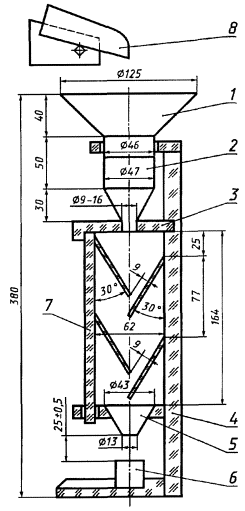 Весы лабораторные общего назначения типа ВЛР-200 г или аналогичного типа. Регулятор напряжения на 220 - 300 В. Стандартные образцы предприятий состава никелевого порошка или государственные стандартные образцы состава стали СГ-10. Соответствующие анализатору стандартные образцы состава. Секундомер [4]. Тигли графитовые. Пресс гидравлический, обеспечивающий получение усилия не менее 1500 Н. Пресс-форма стальная с пуансоном диаметром 5 - 6 мм, высотой 50 - 60 мм. Пинцет пластмассовый. Пинцет медицинский по ГОСТ 21241. Эксикатор 2-100, 2-140 или 2-250 по ГОСТ 25336. Аскарит [5]. Магния перхлорат (ангидрон). Гелий газообразный по ГОСТ 20461 или аргон газообразный по ГОСТ 10157. Спирт этиловый ректификованный технический по ГОСТ 18300. Стекловолокно по ГОСТ 10727. Вата медицинская гигроскопическая по ГОСТ 5556. Ткань хлопчатобумажная бязевой группы по ГОСТ 29298. 7.3.4 Проведение анализа 7.3.4.1 Включение анализатора, его прогрев, градуировку и выполнение анализа производят согласно инструкции по эксплуатации анализатора. Определение поправки контрольного опыта проводят в соответствии с инструкцией [6]. Значение контрольного опыта не должно превышать 4·10-4 %. 7.3.4.2 При анализе никелевого порошка на содержание кислорода берут навеску массой в зависимости от модификации газоанализатора в виде порошка или спрессованной таблетки. По окончании анализа определяют коэффициент экстракции, который не должен превышать значение контрольного опыта. Массовую долю кислорода в порошке определяют по показаниям цифрового вольтметра в процентах. За результат анализа принимают среднее арифметическое результатов трех параллельных определений массовой доли кислорода. 7.3.4.3 Абсолютные допускаемые расхождения результатов параллельных определений, характеризующие сходимость метода определения кислорода (d) и результатов двух анализов, характеризующих воспроизводимость метода (D), а также нормируемый показатель точности (∆) не должны превышать значений, приведенных в таблице 8. 7.3.4.4 Контроль точности результатов определения кислорода осуществляют по стандартным образцам с аттестованной характеристикой кислорода и проводят один раз в месяц одновременно с партией проб. 7.4 Допускается при определении массовых долей всех примесей в никелевых порошках применять другие методы анализа, по метрологическим характеристикам не уступающие указанным в стандарте. При разногласиях в оценке качества никелевого порошка должны использоваться методы анализа, указанные в данном стандарте. 7.5 Размер части никелевого карбонильного порошка групп Т и Л определяют на лазерном дифракционном микроанализаторе. Прибор состоит из измерительного блока и компьютера. Измерительный блок содержит гелий-неоновый лазер, необходимую оптическую систему и измерительную ячейку. Навеску порошка массой около 20 г подвергают сухому диспергированию и потоком воздуха подают в измерительный блок, где частицы вновь диспергируются и вводятся в лазерный луч. Результаты измерений выдаются с помощью компьютера в виде графика и таблиц. 7.5.1 Погрешность измерения количества частиц определенного размера должна быть не более 3 % при доверительной вероятности Р = 0,95. Допускается проводить измерение гранулометрического состава карбонильных порошков групп Т и Л другими методами, обеспечивающими точность измерений в пределах, ус