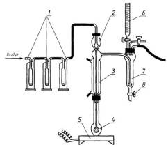 Дата введения 2000-07-01 1 Область примененияНастоящий стандарт устанавливает объемный метод определения азота в губчатом титане (при массовой доле азота от 0,005 % до 0,5 %) по ГОСТ 17746. Метод основан на растворении титана в серной и фтористо-водородной кислотах, в результате чего в растворе образуются аммонийные соли. Последние разлагают гидроксидом натрия с выделением аммиака, который поглощают слабокислым раствором индикатора Таширо и титруют раствором серной кислоты. 2 Нормативные ссылкиВ настоящем стандарте использованы ссылки на следующие стандарты: ГОСТ 8.315-97 Государственная система обеспечения единства измерений. Стандартные образцы. Основные положения, порядок разработки, аттестации, утверждения, регистрации и применения ГОСТ 3118-77 Кислота соляная. Технические условия ГОСТ 3640-94 Цинк. Технические условия ГОСТ 4165-78 Медь (II) сернокислая 5-водная. Технические условия ГОСТ 4204-77 Кислота серная. Технические условия ГОСТ 4328-77 Натрия гидроокись. Технические условия ГОСТ 10484-78 Кислота фтористоводородная. Технические условия ГОСТ 17746-96 Титан губчатый. Технические условия ГОСТ 18300-87 Спирт этиловый ректификованный технический. Технические условия ГОСТ 23780-96 Титан губчатый. Методы отбора и подготовки проб ГОСТ 25086-87 Цветные металлы и их сплавы. Общие требования к методам анализа 3 Общие требования3.1 Общие требования к методу анализа - по ГОСТ 25086. 3.2 Отбор и подготовка проб проводится по ГОСТ 23780. 3.3 За результат анализа принимают среднее арифметическое результатов двух измерений. В начале смены проводят не менее двух контрольных опытов. 4 Средства измерений и вспомогательные устройстваУстановка для определения содержания азота (рисунок 1) состоит из: промывных склянок 1, заполненных на 1/3 серной кислотой (1:1), воронки 2 с гидравлическим затвором, холодильника 3 (рисунок 2), колбы типа Къельдаля 4 вместимостью 250 см3, колбонагревателя 5, микробюретки 6 вместимостью 5 см3, сосуда для поглощения и титрования аммиака 7 (рисунок 3), крана для слива 8.