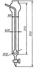 Колба коническая вместимостью 250 см3 с затвором (рисунок 4), служащая для разложения навески. Резервуар с индикаторной водой. Прибор электронагревательный со слабым нагревом закрытого типа. Воздух сжатый или магистраль со сжатым воздухом давлением 0,01-0,02 МПа, расход около 3 дм3/мин. Кислота серная по ГОСТ 4204, разбавленная 1:1, 1:4. Кислота серная. Стандарт-титр (фиксанал) по действующему нормативному документу, растворы молярной концентрации 0,005 и 0,0025 моль/дм3. Массовую концентрацию этих растворов серной кислоты устанавливают по стандартному образцу гитана, близкому по химическому составу и содержанию азота к анализируемой пробе титана и проведенному через все стадии анализа. Массовую концентрацию раствора серной кислоты Т, г/см3 азота, вычисляют по формуле