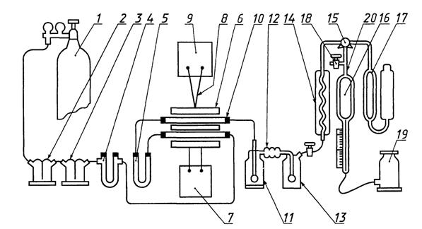 4.5.2. Контроль точности результатов анализа проводят по стандартному образцу в соответствии с ГОСТ 25086. Допускается проводить контроль точности результатов анализа по методу добавок в соответствии с ГОСТ 25086. 5. Газообъемный метод5.1. Средства измерений и вспомогательные устройства Установка для определения содержания углерода (рисунок 2) состоит из баллона с кислородом 1, снабженного редукционным вентилем; склянки Тищенко 2, содержащей раствор перманганата калия массовой концентрации 40 г/дм3 в растворе гидроксида калия массовой концентрации 400 г/дм3; склянки Тищенко 3, содержащей серную кислоту; U-образной трубки 4, заполненной в первой половине (по ходу кислорода) натронной известью, а во второй - хлоридом кальция; U-образной трубки 5, наполненной на 2/3 аскаритом и на 1/3 хлоридом кальция; электропечи 6 с силитовыми нагревателями и регулятором напряжения 7; термопары платино-платинородиевой 8; терморегулятора 9; трубки фарфоровой неглазурованной длиной 750 мм, внутренним диаметром 18 - 20 мм (концы трубки должны выступать из печи на менее чем на 160 мм с каждой стороны и перед применением трубки должны быть прокалены при температуре 1573 К по всей длине); склянки 11, содержащей хромовую смесь; трубки 12, заполненной стеклянной ватой; склянки 13, содержащей раствор йодида калия массовой концентрации 100 г/дм3; газоанализатора ГОУ, включающего змеевиковый холодильник 14, трехходовой кран 15, соединяющий газоизмерительную бюретку 16 с холодильником и поглотительным сосудом 17; одноходового крана 18, соединяющего газоизмерительную бюретку с атмосферой.