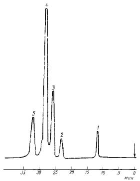 Типовая хроматограмма каменноугольного ксилола приведена на чертеже. (Измененная редакция, Изм. № 3). 3.2.4. Обработка результатов Измеряют площади пиков каждого компонента на хроматограмме. Площадь пика каждого компонента (Si) в квадратных миллиметрах вычисляют по формуле Si = hi · bi · Mi · Ki, где hi - высота пика, мм; bi - ширина пика, измеренная на середине его высоты, мм; Mi - масштаб записи сигнала пика; Ki - градуировочный коэффициент. В расчет принимают ширину линии, очерчивающей пик. Массовую долю каждого компонента (Xi) в процентах вычисляют по формуле