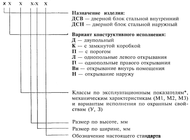 4.4 В зависимости от наличия охранных свойств дверные блоки подразделяют на: дверные блоки обычного исполнения, оснащенные замками III - IV классов по ГОСТ 5089, блокировочными противосъемными устройствами; дверные блоки усиленного исполнения, оснащенные замками III - IV классов по ГОСТ 5089, усиленными петлями, блокировочными противосъемными устройствами, многоригельными замками с запиранием по периметру, с прочностными характеристиками не ниже класса М 2; дверные блоки защитные - дверные блоки усиленного исполнения, с прочностными характеристиками не ниже класса M 1 и соответствующие требованиям, установленным в приложении В. Примечание - В условном обозначении дверных блоков усиленного исполнения добавляется индекс «У», защитного исполнения - «3». 4.5 Структура условного обозначения дверных блоков: