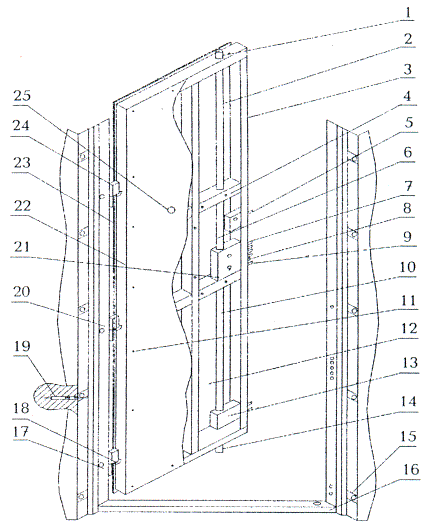 1 - верхний запирающий ригель; 2 - верхняя тяга основного замка; 3 - каркас полотна (сваренные стальные профили); 4 - места крепления внутреннего «лючка»; 5 - задвижка; 6 - место крепления верхней тяги; 7 - ригеля засова сувальдного замка; 8 - защелка; 9 - засов цилиндрового замка; 10 - нижняя тяга основного замка; 11 - места крепления отделки; 12 - внутренняя полость для заполнителя; 13 - направляющая вертикальной тяги; 14 - нижний запирающий ригель; 15 - монтажное «ушко»; 16 - порог; 17 - отверстие под противосъемный ригель (штырь); 18 - противосъемный пассивный ригель (штырь); 19 - монтажный анкер; 20 - коробка (рама); 21 - комбинированный сувальдно-цилиндровый замок; 22 - внутренний стальной лист; 23 - наружный стальной лист; 24 - петлевой узел; 25 - глазок Рисунок 1 - Пример конструкции дверного блока, полотно которого сварено из двух стальных листов и стальных профилей, коробка (рама) - из стального гнутого профиля