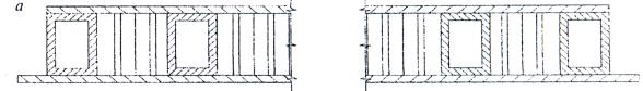 Рисунок 8 - Примеры расположения усиливающих профилей в дверном Полотне 5.1.5 Допускается применять вместо внутреннего цельного стального листа стыкованные листовые заготовки, сваренные по усиливающим профилям, при этом места точек сварки устанавливают в конструкторской документации. В качестве внутреннего листа допускается применять твердые древесно-волокнистые плиты по ГОСТ 4598 или другие твердые листовые материалы, обеспечивающие достаточную прочность. 5.1.6 Для осуществления ремонта замков и защелок в месте их установки во внутреннем листе рекомендуется предусматривать «лючок», который крепится на механических связях. 5.1.7 Запирающие устройства (замки, защелки, дополнительные засовы) рекомендуется крепить на винтах через специальные подкладки и прижимные скобы с нарезанной резьбой. Крепление запирающих устройств должно быть прочным и надежным, исключающим их самопроизвольное смещение во время эксплуатации. Не рекомендуется крепить замок посредством сварки (в случае технологической необходимости применения сварки следует учитывать возможность термического влияния на легкоплавкие пластиковые и другие детали замка). Замок должен устанавливаться согласно требованиям конструкторской документации так, чтобы во время эксплуатации дверного блока не возникало сжимающих или изгибающих нагрузок на замок. 5.1.8 В конструкциях наружных и входных в квартиру дверных блоков (для повышения звукоизоляции и сопротивления теплопередаче) рекомендуется устанавливать не менее двух контуров уплотняющих прокладок. Уплотняющие прокладки должны устанавливаться по всему периметру притвора. Зазоры в стыках прокладок не допускаются. Прилегание прокладок должно быть плотным. Уплотняющие прокладки для наружных дверных блоков должны быть стойкими к климатическим и атмосферным воздействиям и испытаны на долговечность в испытательных центрах, аккредитованных на право проведения таких испытаний. 5.1.9 Требования настоящего стандарта распространяются на дверные блоки площадью, не превышающей 9 м2, при этом высота открывающихся дверных полотен рекомендуется не более 2200 мм, а ширина - не более 1200 мм. Допускается применение неоткрывающихся горизонтальных и вертикальных полотен-вставок. Рекомендуемая масса дверных полотен - не более 250 кг (расчетный показатель). Изготовление дверных блоков (полотен) с площадью, массой и размерами, превышающими указанные значения, должно быть подтверждено результатами лабораторных испытаний или дополнительными прочностными расчетами согласно действующим строительным нормам. Примечание - Наибольшие размеры полотен дверных блоков конкретных типов в зависимости от массы полотна, моментов сопротивления сечений профилей каркаса полотна, жесткости сечения средней части полотна (включая наружную и внутреннюю обшивки, заполнение, усиливающие профили), расположения (и типов) петель и запирающих приборов должны быть приведены в конструкторской документации предприятия-изготовителя. 5.1.10 Расположение и размеры отверстий для установки замков и других запирающих устройств устанавливают в конструкторской документации с учетом требований ГОСТ 5089. 5.1.11 Места отверстий, предназначенных для входа засова, рекомендуется защищать специальными коробами. Короба ввариваются в профиль коробки (рамы) так, чтобы он