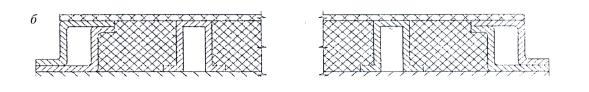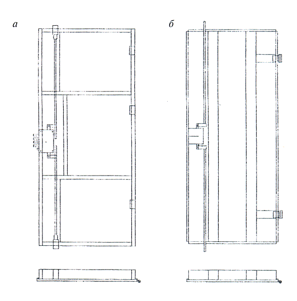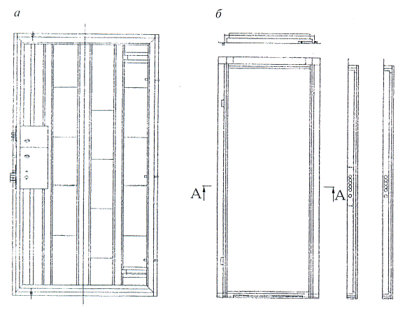 Рисунок 6 - Примеры конструкций дверных полотен, сваренных из двух плоских стальных листов и стальных профилей (а) и дверного полотна типа «гнутый короб» (б) с вертикальными усиливающими профилями