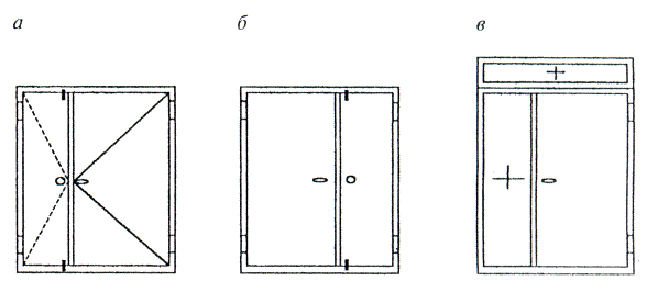 а - дверной блок правого открывания; б - дверной блок левого открывания; в - дверной блок правого открывания с горизонтальными и вертикальными полотнами-вставками Рисунок А. 1 — Определение изделий по направлению открывания полотен горизонтальное (вертикальное) полотно-вставка: Неоткрывающееся полотно, устанавливаемое над или рядом с открывающимся полотном (рисунок А.1, в). запирающие устройства: Устройства, предназначенные для фиксации дверных полотен в закрытом положении (замки, защелки и т.д.). усиливающий профиль: Профиль, устанавливаемый внутри дверных полотен для обеспечения необходимой жесткости и прочности конструкции. лючок: Металлический лист, устанавливаемый на механических связях с внутренней стороны полотна в месте крепления замка, обеспечивающий возможность доступа к замку в случае необходимости его ремонта. противосъемные пассивные ригели (штыри): Усиливающие ригели, связывающие закрытое полотно с коробкой, устанавливаемые на вертикальном профиле полотна со стороны петель (или на вертикальном профиле коробки со стороны петель) и обеспечивающие дополнительную стойкость дверного блока к взлому. монтажные «ушки»: Металлические крепежные пластины, как правило, приваренные к профилям коробки (рамы), обеспечивающие возможность крепления дверного блока в стеновом проеме. (справочное) Примеры