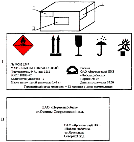 в скобках порядковый номер пакета, например: 10) полное или условное зарегистрированное в установленном порядке наименование грузоотправителя, 11) наименование пункта отправления с указанием железнодорожной станции отправления и сокращенное наименование дороги отправления, 12) надписи транспортных организаций (в соответствии с правилами перевозок грузов на соответствующем виде транспорта), 13) количество единиц тары в штуках; г) характеризующие дополнительную маркировку продукции: 1) рекламная информация, характеризующая особые свойства или преимущества данного материала по сравнению с аналогами (устанавливается изготовителем или продавцом), 2) дополнительные знаки, зарегистрированные и утвержденные в установленном порядке, 3) международная уникальная идентификация транспортируемых единиц в виде символа штрихового кода (для транспортируемых единиц) (при наличии); д) характеризующие продукцию, поставляемую на экспорт: 1) номер контракта и (или) заказа иностранного покупателя, 2) номер грузового места - указывается дробью: в числителе - порядковый номер места в партии; в знаменателе - количество мест в партии, 3) полное наименование или условное обозначение иностранного грузополучателя, 4) наименование пункта назначения с указанием станции или порта перегрузки (при транспортировании железнодорожным и водным видами транспорта) в полном соответствии с нормативными документами на материалы, 5) страна назначения груза, 6) станция и дорога назначения груза (при транспортировании железнодорожным транспортом), 7) товарные знаки и марки грузоотправителя, 8) наименование экспортирующей организации (фирмы, предприятия) - полное или условное, 9) пункт отправления груза, 10) станция и дорога отправления (при транспортировании железнодорожным транспортом), 11) габаритные размеры грузового места в сантиметрах, 12) массы брутто и нетто в килограммах, 13) объем грузового места в кубических метрах, 14) надписи «Экспорт», «Страна-изготовитель и (или) поставщик», 15) дополнительные требования контракта в части маркировки продукции. 4.1.2 Маркировочные данные двухкомпонентных лакокрасочных материалов, предназначенных для розничной торговли, указывают в НД или ТД на продукцию. 4.1.3 На крышке или кольце банки с лакокрасочным материалом, предназначенным для розничной торговли, должна быть помещена выкраска пигментированного материала. Форму и размер выкраски устанавливает изготовитель. 4.1.4 Необходимость нанесения на транспортную тару манипуляционных знаков «Ограничение температуры» и «Предел по количеству ярусов в штабеле» указывают в НД или ТД на продукцию. 4.1.5 Допускается не наносить знак опасности, номер ООН и классификационный шифр на деревянные, металлические, картонные и полимерные ящики массой брутто не более 30 кг при поставке лакокрасочной продукции в торговую сеть водным и автомобильным транспортом при соблюдении следующих условий: - для грузов со степенью опасности 3 по ГОСТ 19433 вместимость потребительской тары не должна превышать 5 дм3; - для грузов со степенью опасности 2 по ГОСТ 19433 вместимость металлической тары не должна превышать 1 дм3, а стеклянной и полимерной тары - 0,5 дм3. 4.1.6 Основные и дополнительные надписи (4.1.1, перечисление в) 6 - 11) допускается наносить не на все, а не менее чем на четыре грузовые места при перевозке грузов в прямо