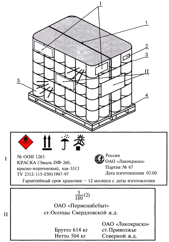 I - транспортная маркировка и маркировка, характеризующая продукцию; II - транспортная маркировка (основные, дополнительные и информационные надписи); 1 - шов термосварки; 2 - банка с этикеткой; 3 - плоская прокладка; 4 - поддон; 5 - термоусадочная пленка Рисунок И.1 ПРИЛОЖЕНИЕ К(рекомендуемое) Нанесение маркировки на тару и транспортные пакеты с продукцией, поставляемой на экспорт